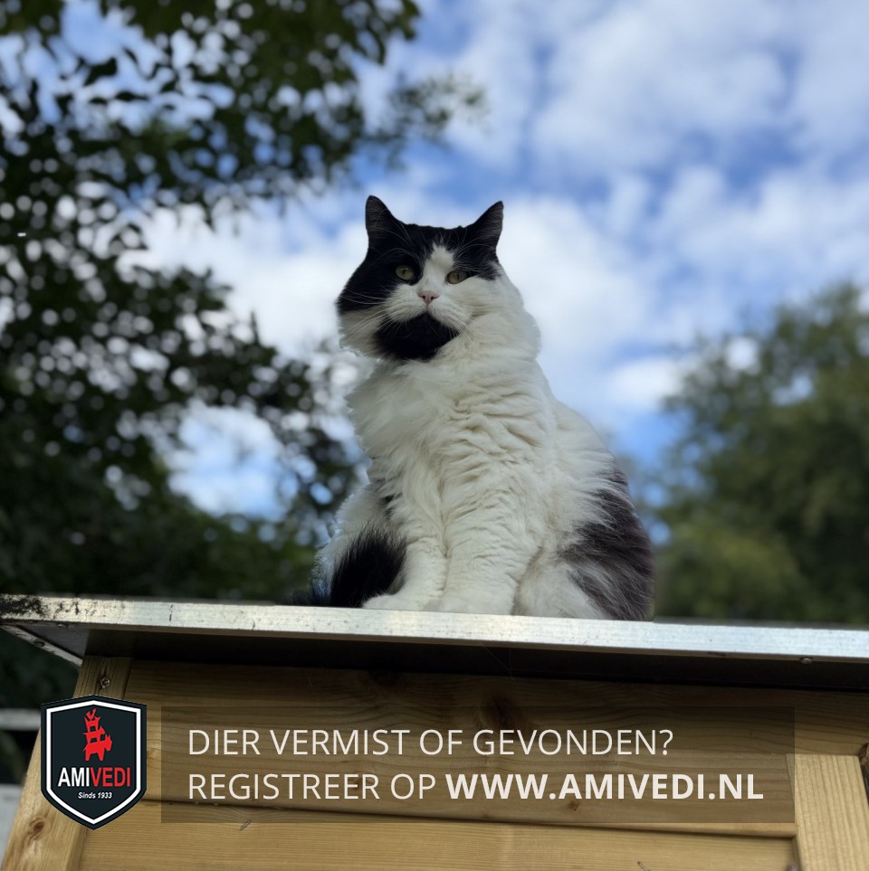 | Signalement | Kruising Noorse boskat / Pers. Rechterkant kop zwart, incl. oor. Zwart tot over het rechter oog. Bovenop de kop zwart. Linker oor zwart tot boven het linker oog. Wit tussen de ogen, onder linker oog, rondom de neus, rechts en links van de neus naar de nek. Boven de mond wit. Zwarte vlek direct onder de mond tot over de kin. Witte borst, voorpoten en buik. Grijze vlek links achter zij/kont. Zwarte staart. |