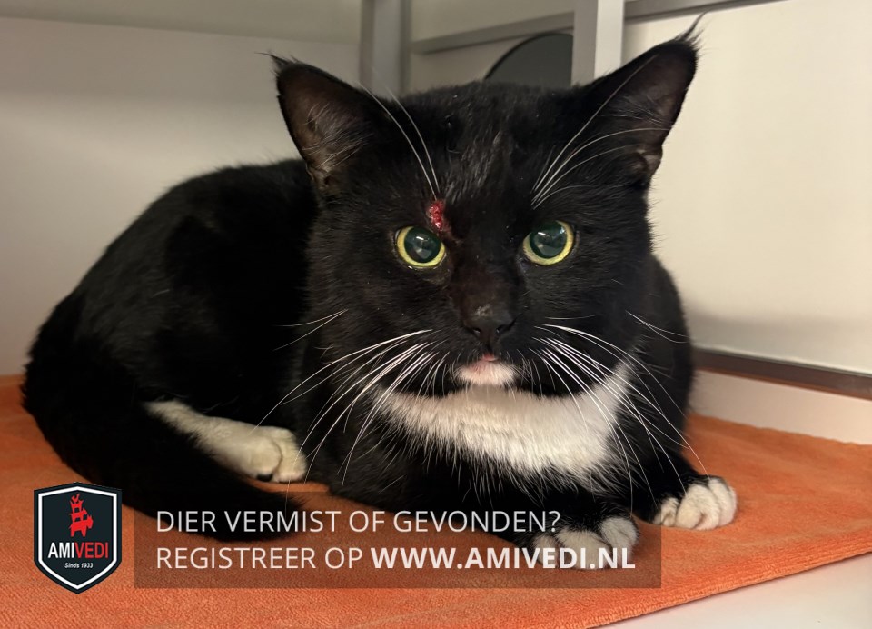| Signalement | Zwarte met witte accenten: witte snorharen, wit kinnetje en witte bef doorlopend naar de borst. Groene ogen, klein wondje boven het rechteroog. Witte teentjes voorpootjes en sokjes achterpootjes. |