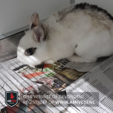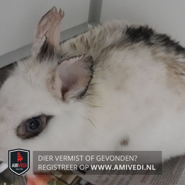 | Signalement | Wit konijn, staande oren. Ogen zwart omrand. Wat zwart vlekjes op de oren. Rug wit, zwarte streep over het midden van de rug. |