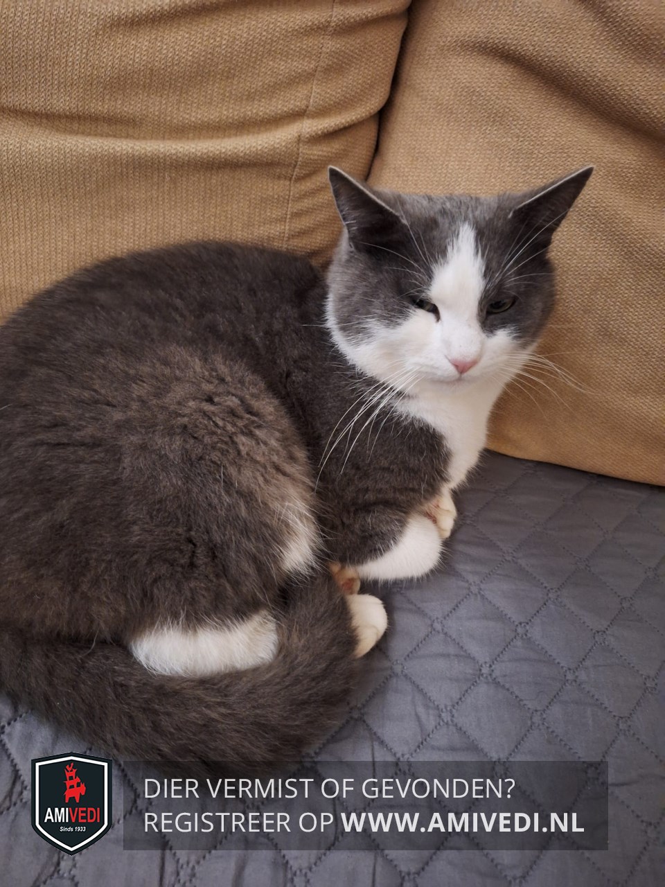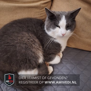 | Signalement | Grijze kat, wit tussen de ogen en om de snuit, kin wit. Hals/bef wit. Achterpoot rechts wit. Rug en staart grijs. |