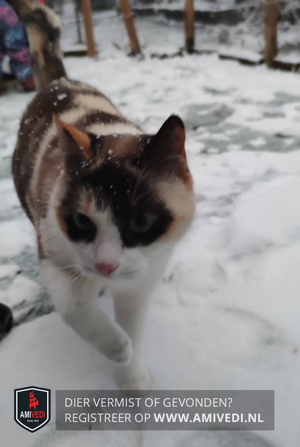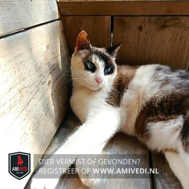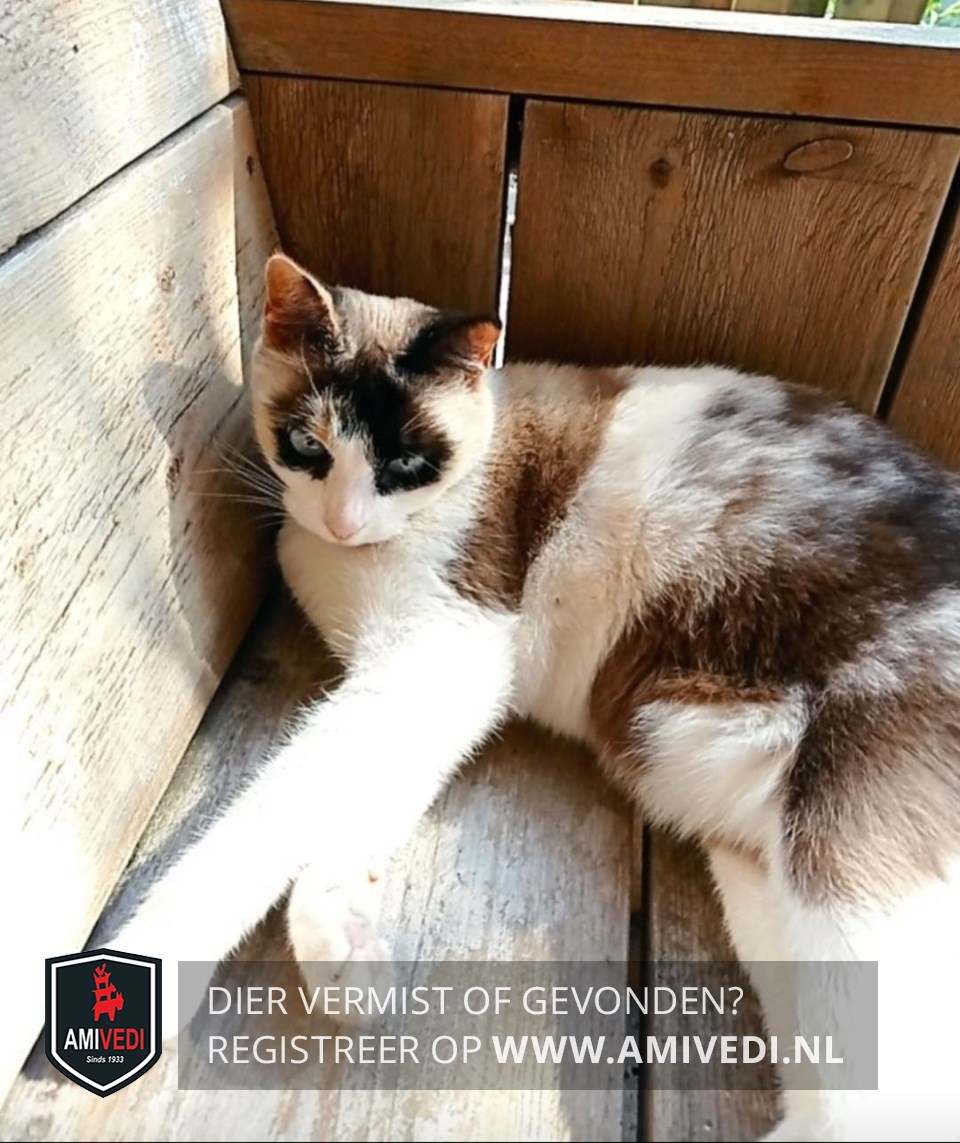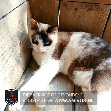 | Signalement | Knak in haar staart Het is een kruising EK en Siamese poes met blauwe ogen en een soort masker om haar ogen ligt een zwartte ring die op het voorhoofd verbonden is, pootjes voor zijn helemaal wit. Ook het kolpje naar de keel toe is wit |
