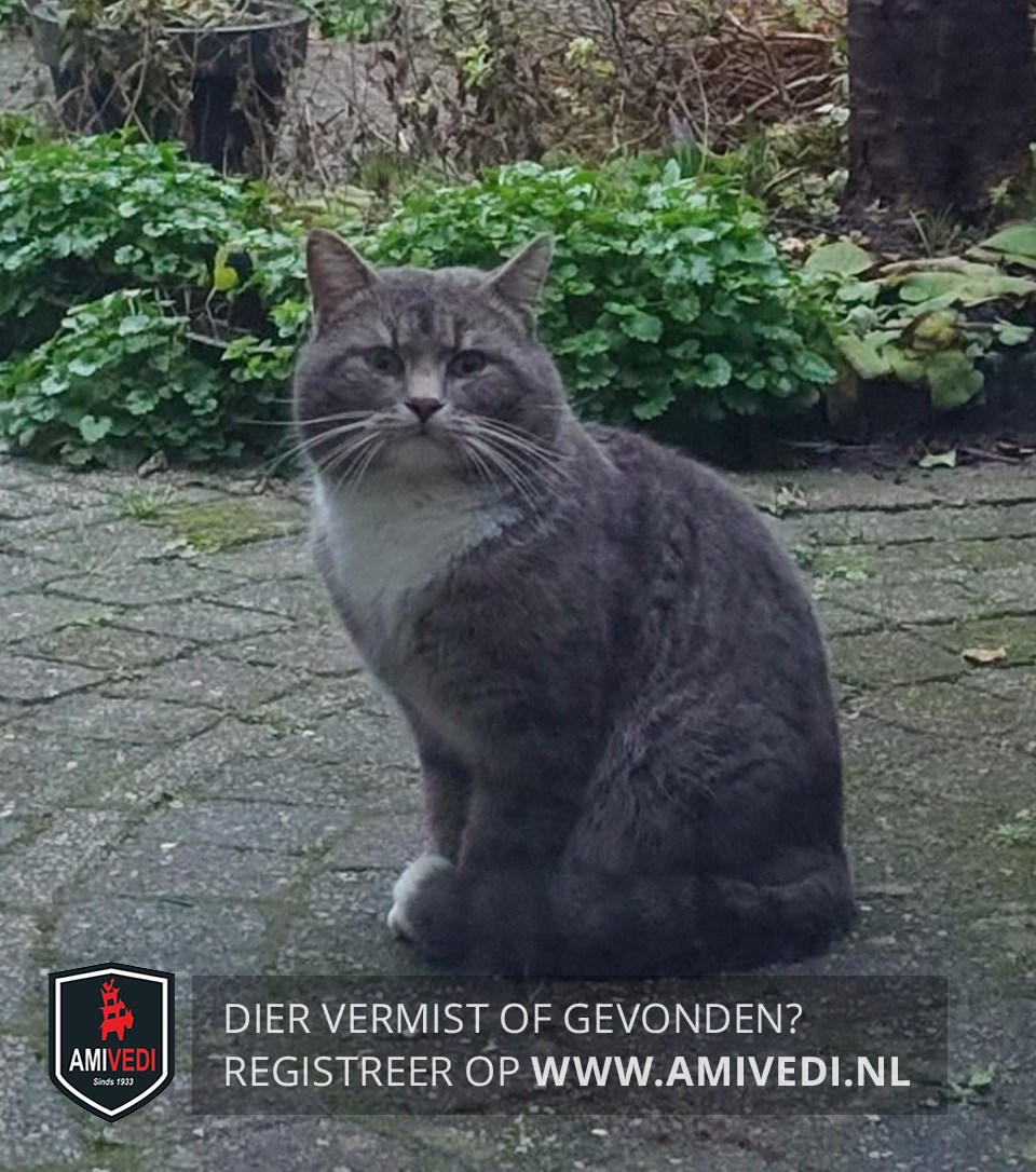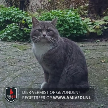 | Signalement | Grijs (blauw) met wit. Grijze kop, incl. de oren. Groene ogen. Witte kin, bef en borst. Grijze rug, zijflanken en staart. Punt van de staart wit. Grijze poten met witte voetjes. Bolle kop maar slank lichaam. Vermoedelijk een kater. |