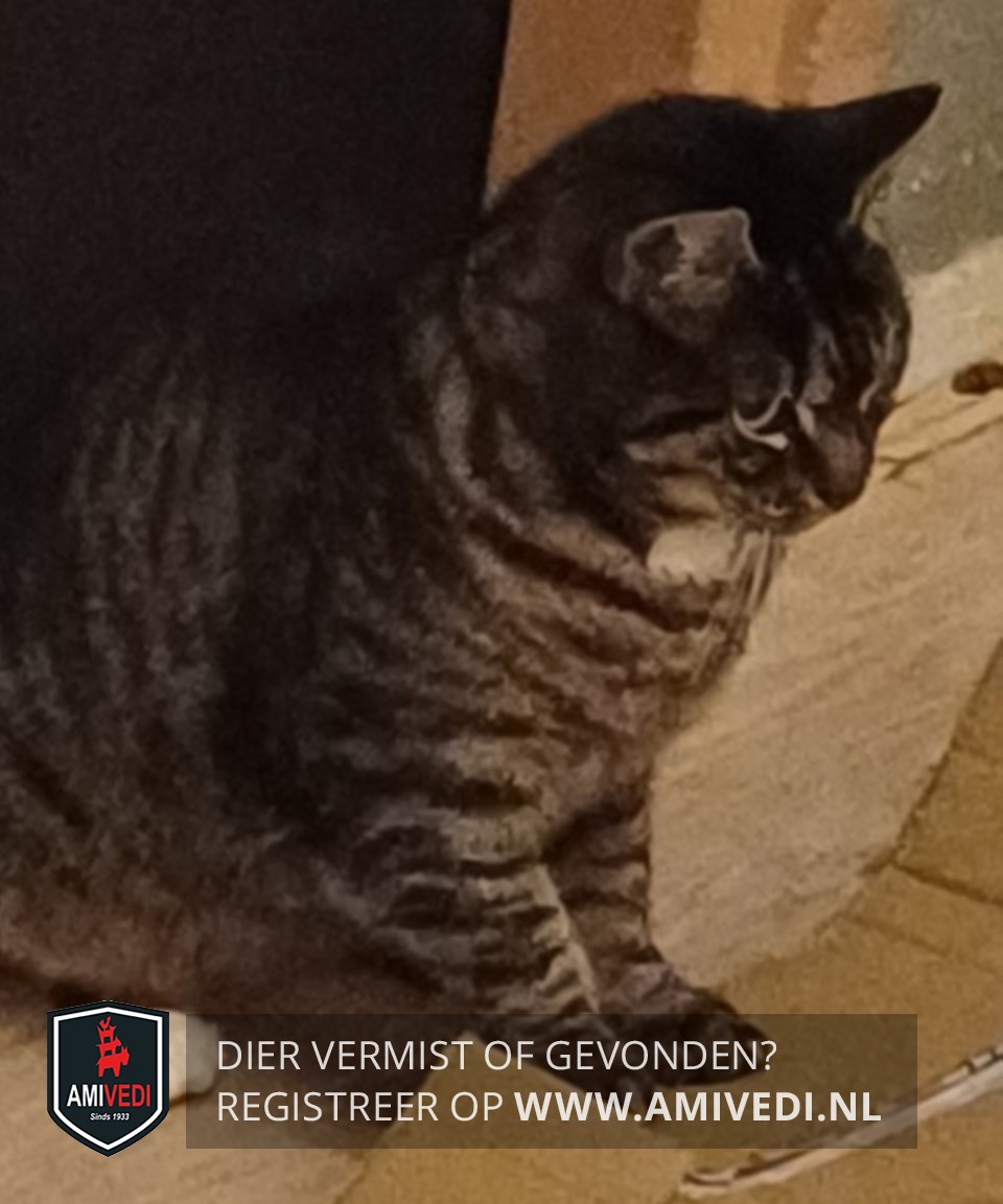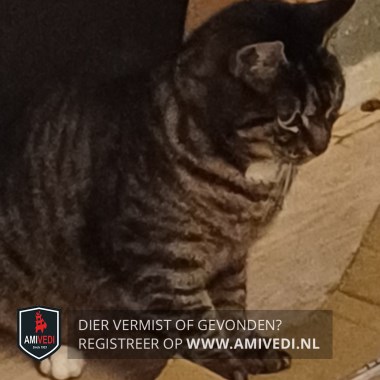 | Signalement | Sok is grijs met zwarte strepen. Heeft een witte vlek op d'r keel en heeft 1 wit sokje rechter achter pootje |