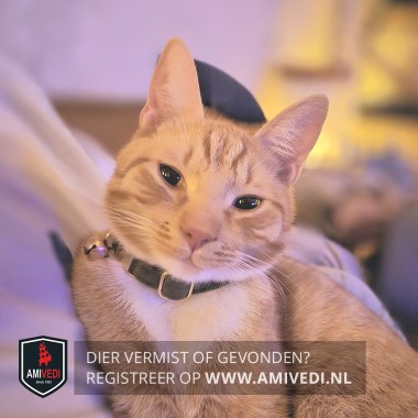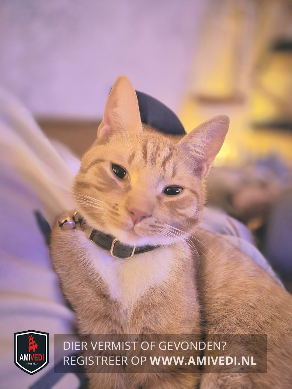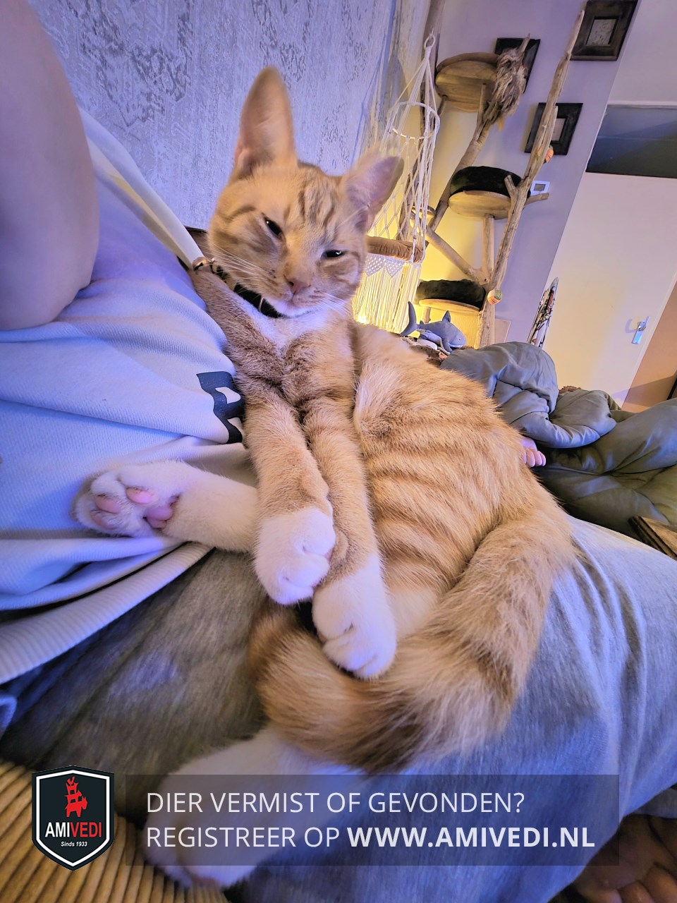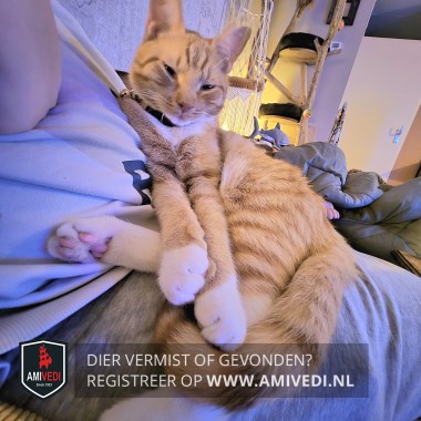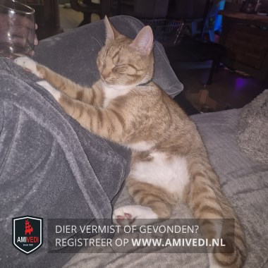 | Signalement | oranje kater met 4 witte voetjes, witte borst en buik. |
