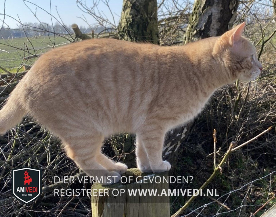 | Signalement | Lichtrood gestreept met witte bef. Lichtbruine ogen. |