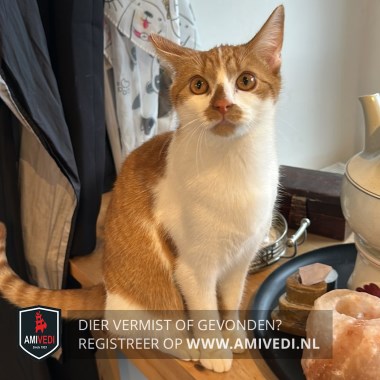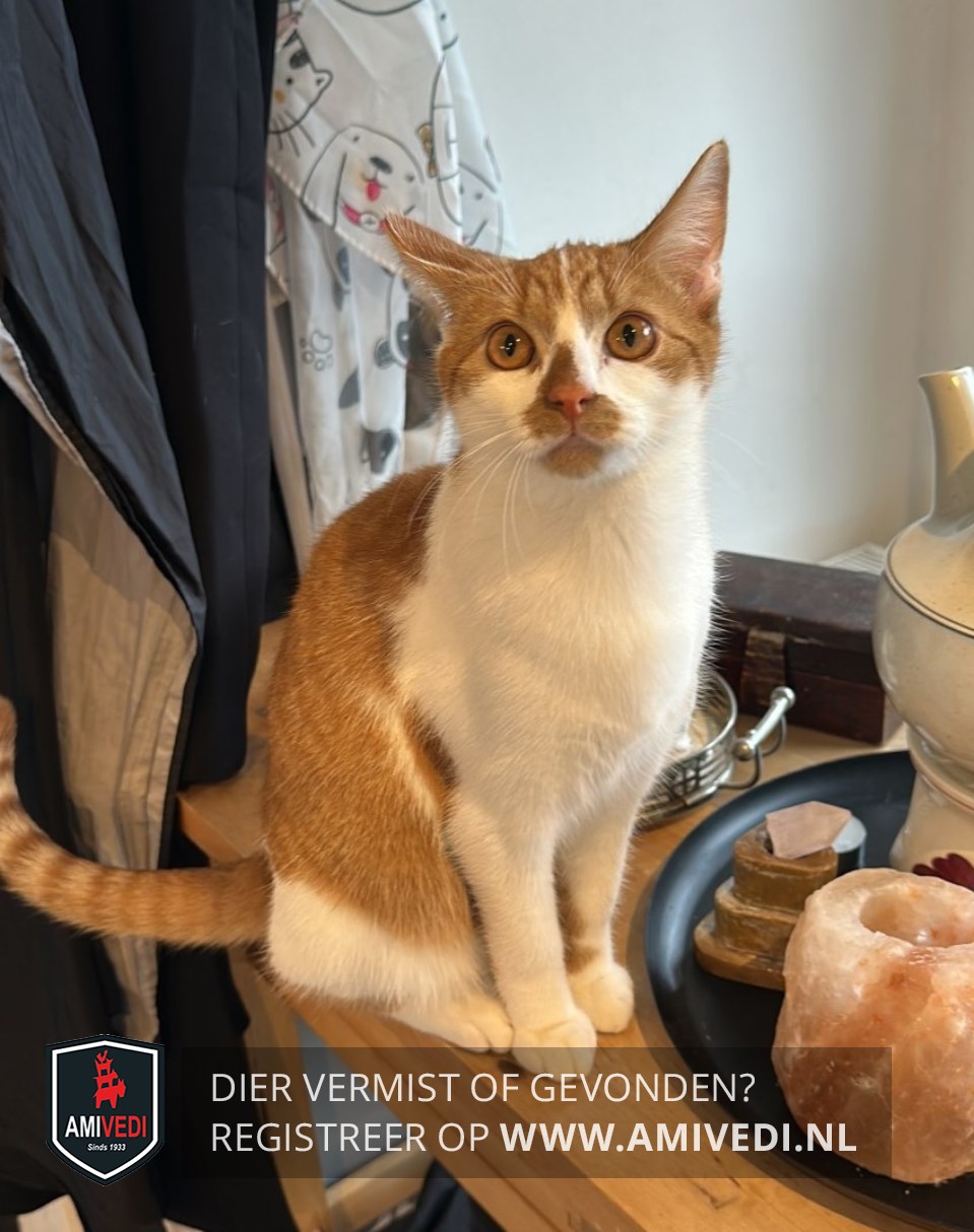 | Signalement | Cypers rood met een wit snoetje, rode vlek neus, witte borst, buik en witte poten. Donkere en lichte ringen in de staart. Jonge kat. |
