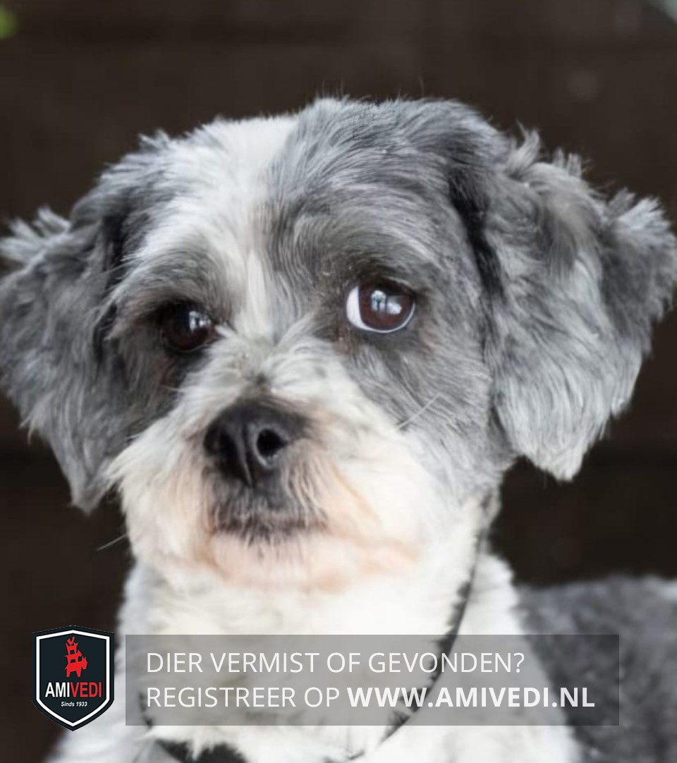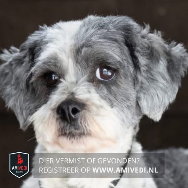 | Signalement | Grijs/wit hondje. Grijs kopje en grijze oren. Wit bovenop kopje en rondom de snuit. Witte borst. grijs lijfje. |