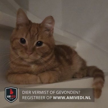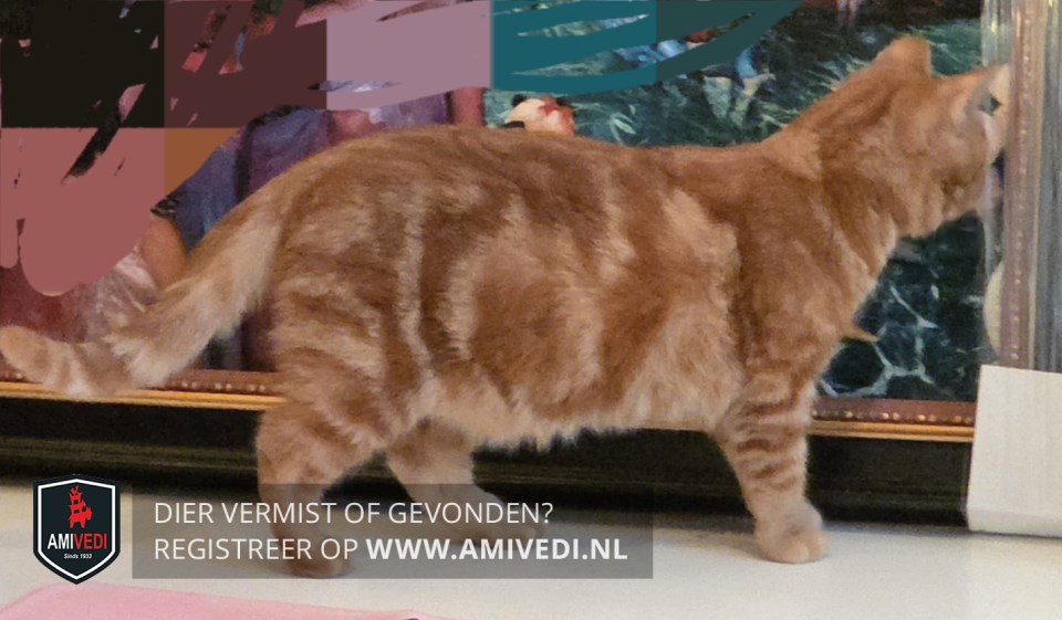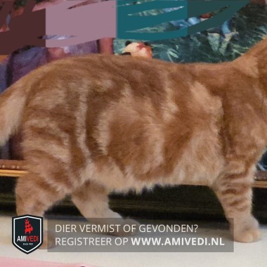 | Signalement | Kleine rode kat met strepen. Heeft dwerggroei dus is vrij compact. Zijn rechter oogje zit altijd net iets meer dicht dan het linker, en z'n linker oortje is net wat korter dan het rechter. Hij heeft op z'n buik een paar witte plekjes. Heeft 2x per dag medicatie nodig. Hij houdt niet van snoepjes, wel van spelen en liquid snacks |