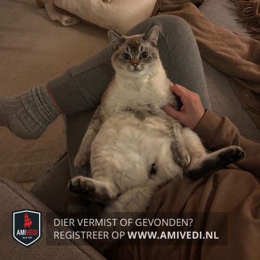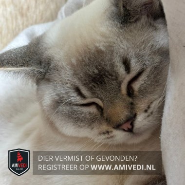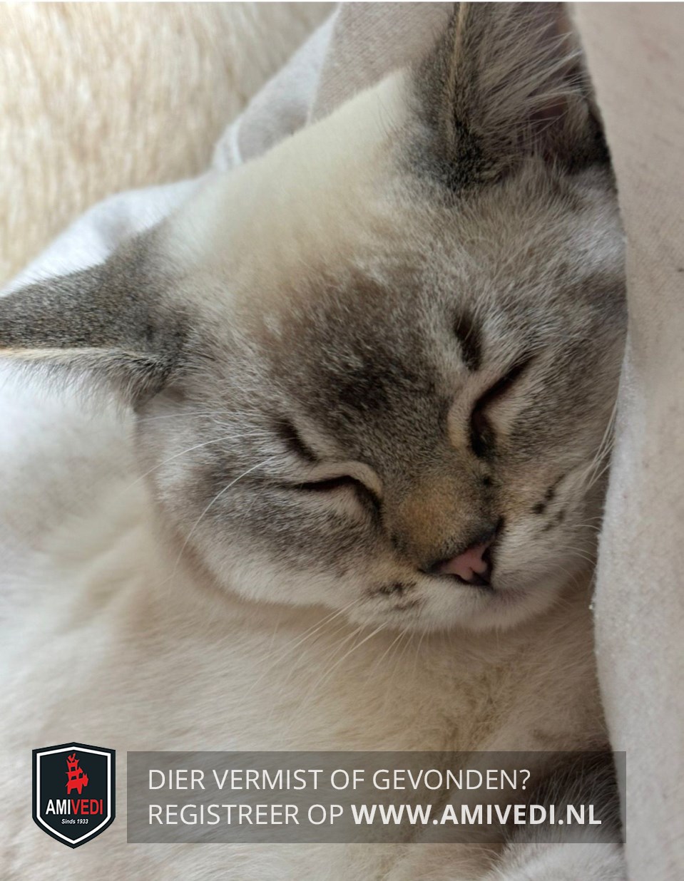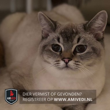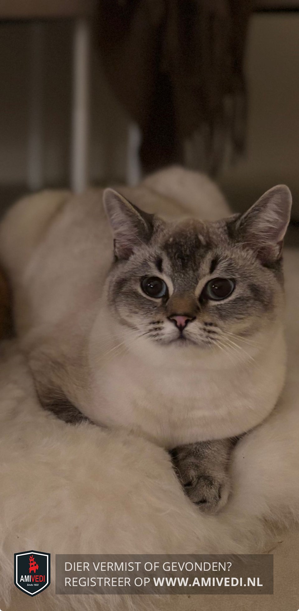 | Signalement | Wit, grijs, bruin, grijs met bruin cyperse tekeningen op het oortjes en kopje, blauwe ogen, bruin neusje, grijze vlek op de borst, grijze pootjes. |