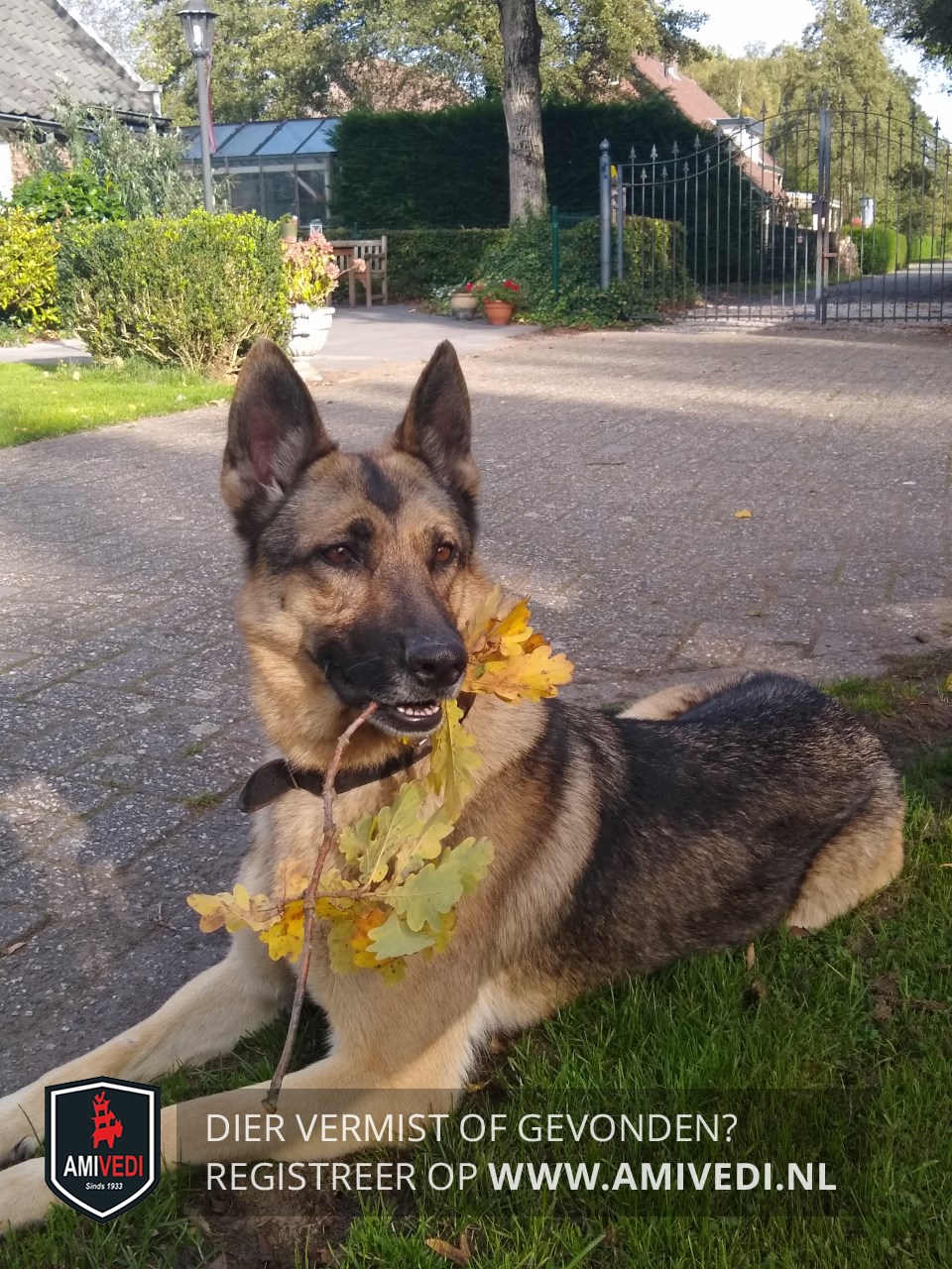| Signalement | Duitse herder. Donkere vacht op rug . Stokharig. Heeft iets ontstoken ogen. Zwart aan de zijkant bij de neus. bruine borst en voorpoten. |
