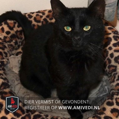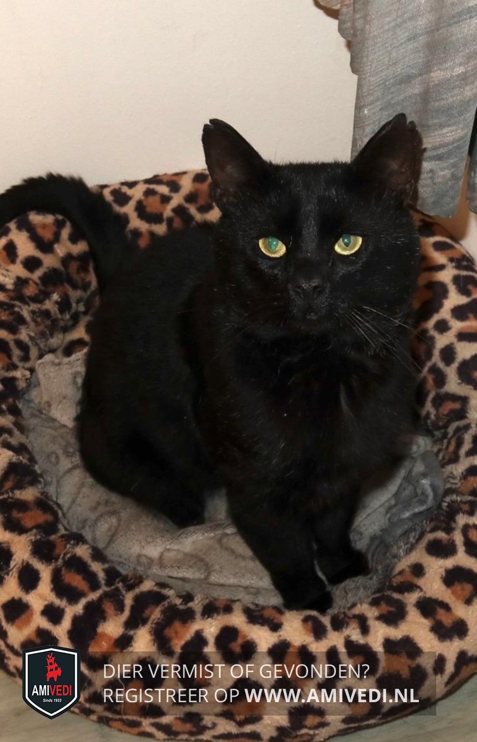 | Signalement | Egaal zwarte kater met een paar knipjes uit de oortjes, groene ogen. |