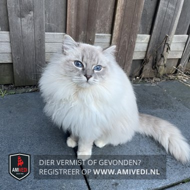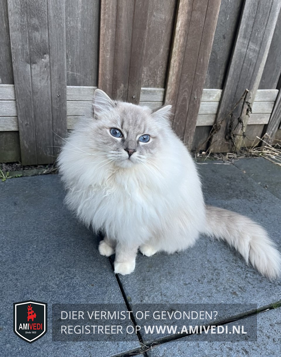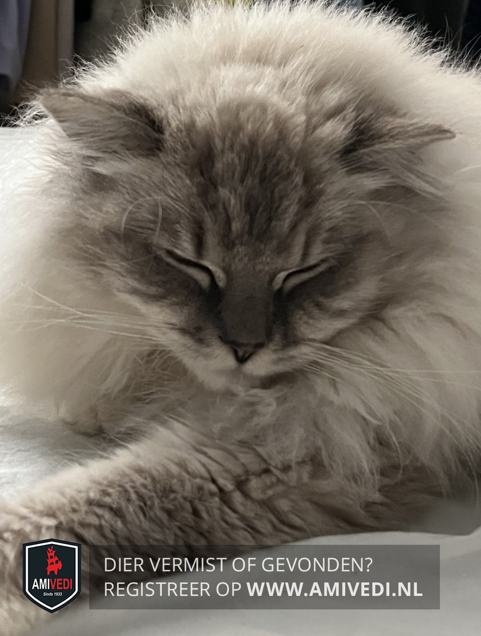 | Signalement | langharig, grijs/witte ragdoll; grijze kop, neus en witte snoet, blauwe ogen, witte borst en bef ,grijze poten, witte onder vacht. |