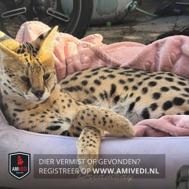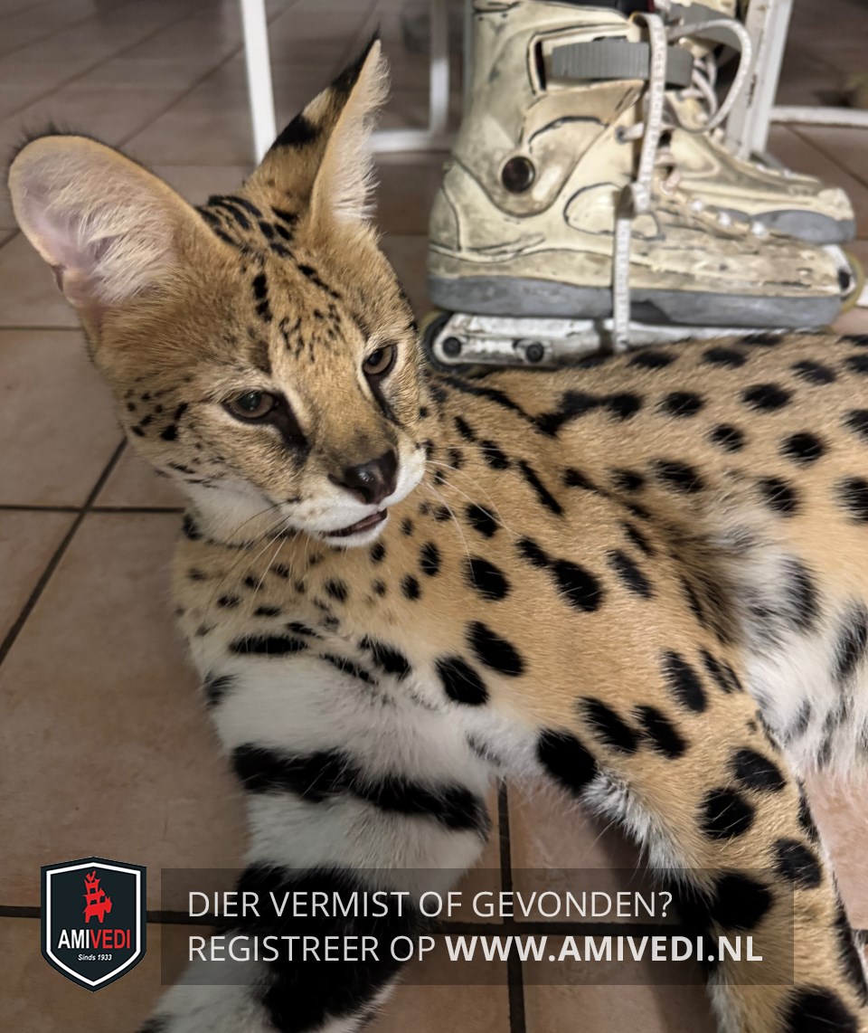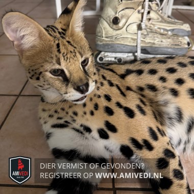 | Signalement | Serval, kop, lijf en voorkant poten ;beige en met zwarte stippen, onderkant kop, buik, achterkant poten; wit met zwarte stippen en op de poten ook strepen. Mocht u hem zien niet zelf benaderen maar bel 075-6156666 !! |