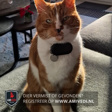 | Signalement | Is erg aanhankelijk, groet iedereen op straat. Heeft zwarte stipjes op zijn neus en onderkant pootjes. rode cyperse kat witte borst en witte vlek op zn rechterwang |