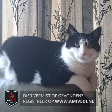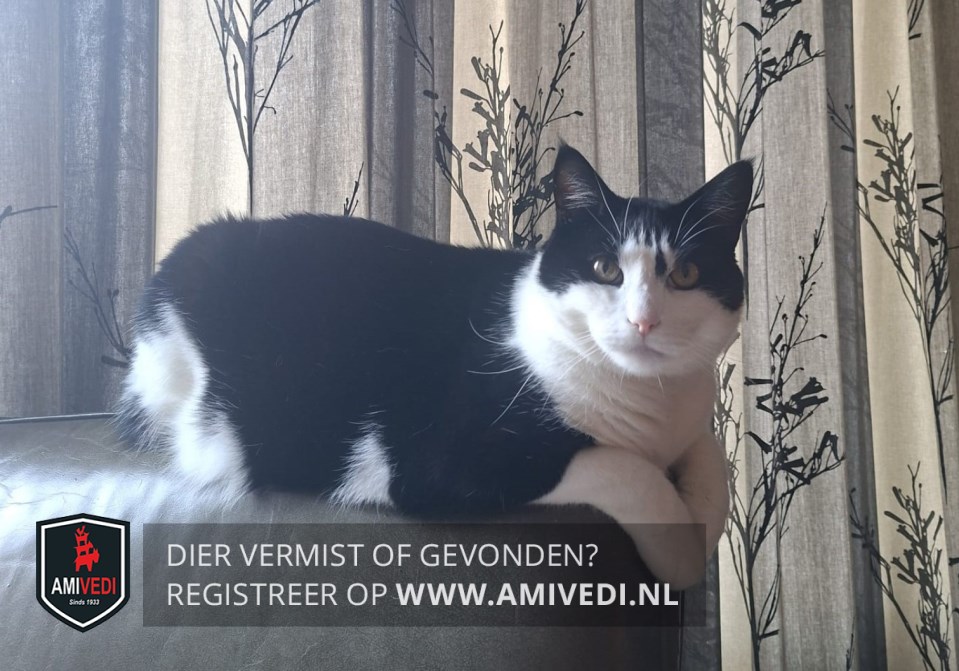 | Signalement | Zwart/witte grote kater. Zwart op het kopje dat doorloopt t/m de oogjes. Boven de neus zwarte streepjes, zwart inktvlekje rechts naast het linker oogje, verder wit snuitje, roze neuspunt. Witte brede sjaal om de nek, witte brede bef. Veel wit op de buik. Zwart dek over de rug en over de zijden. Witte vlek midden op de rechter zijde en wit op de heupen. Zwarte staart met een witte staartpunt. Erg schuw. |