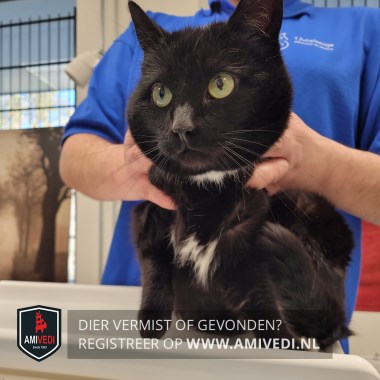 | Signalement | Zwarte poes met witte vlek bef, borst/buik en linker achterpootje. |