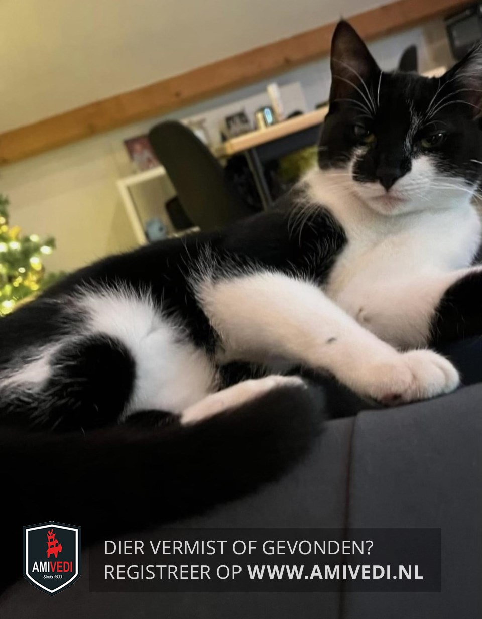 | Signalement | Zwart witte kater Witte vale streep langs de binnenhoek van linker oog naar een witte grote snor onder de neus langs, wit kinnetje, witte borst, witte voorpoten met op de rechtervoorpoot een klein zwart stipje, witte buik, witte achterpoten. |
