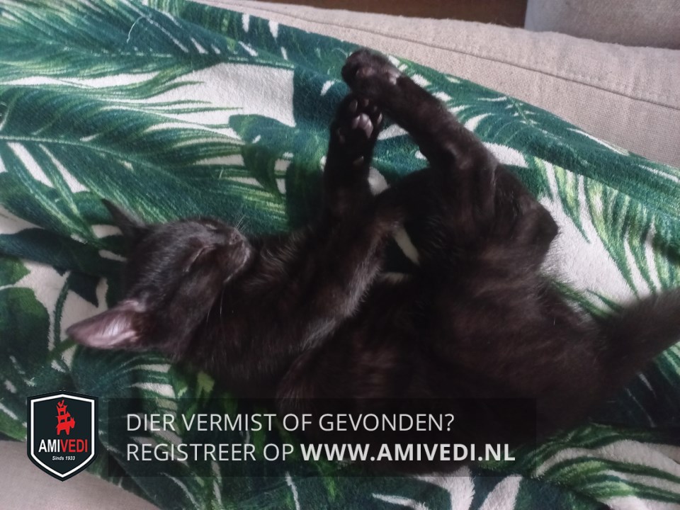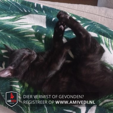 | Signalement | Geheel zwarte kat. paar witte haartjes op zijn buik. |