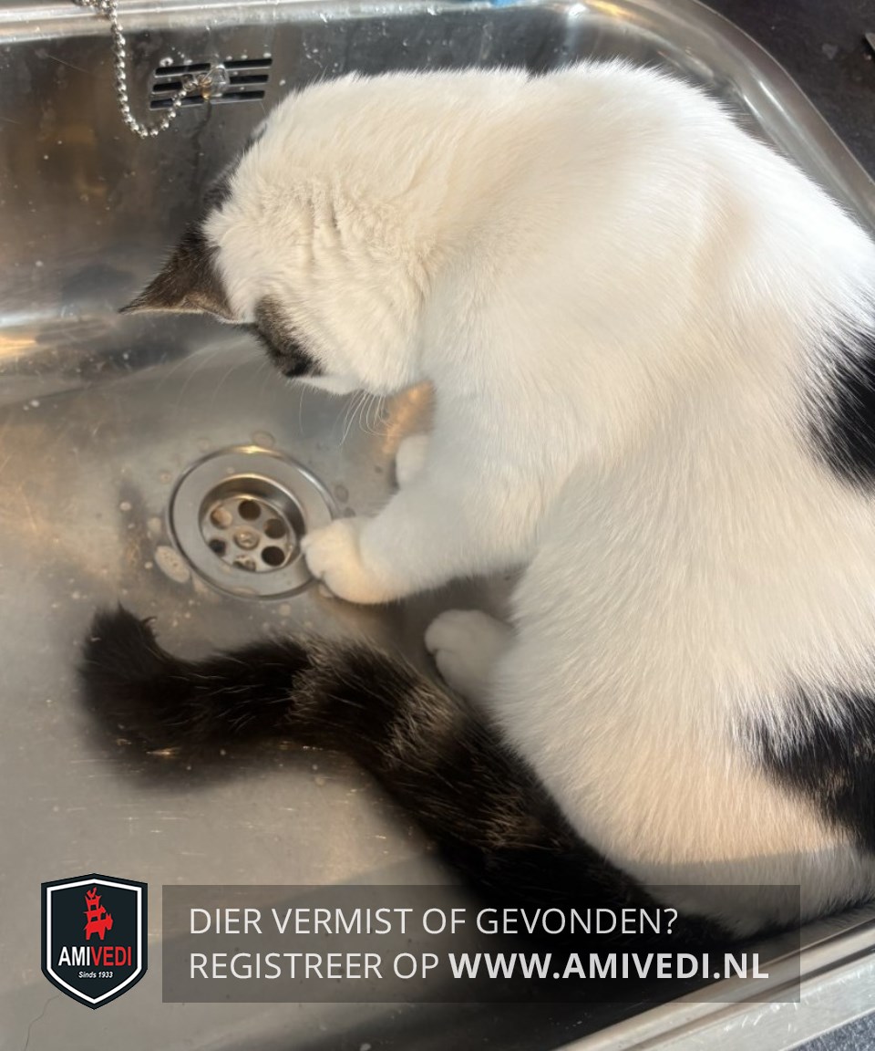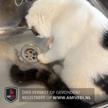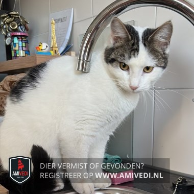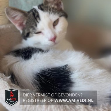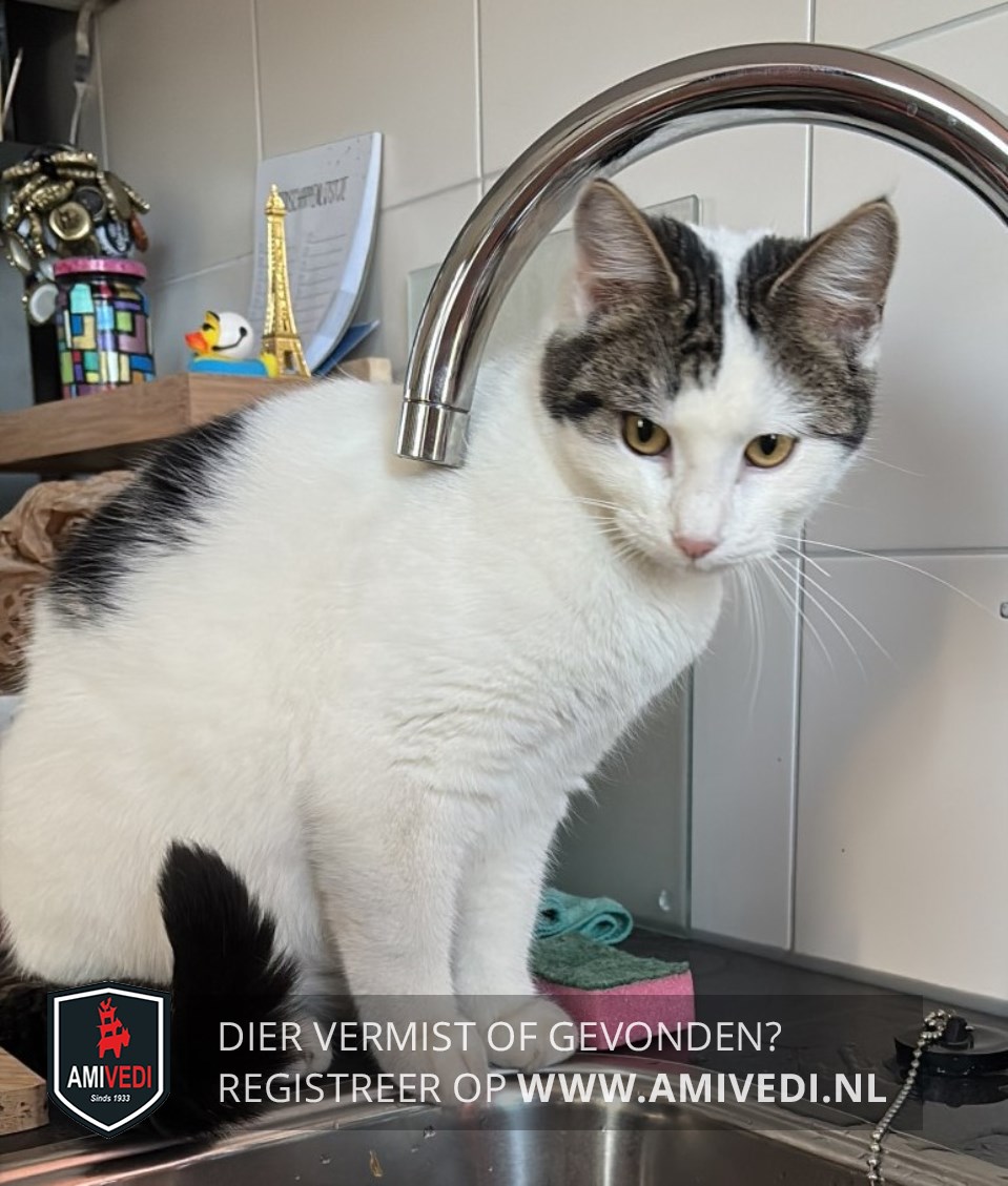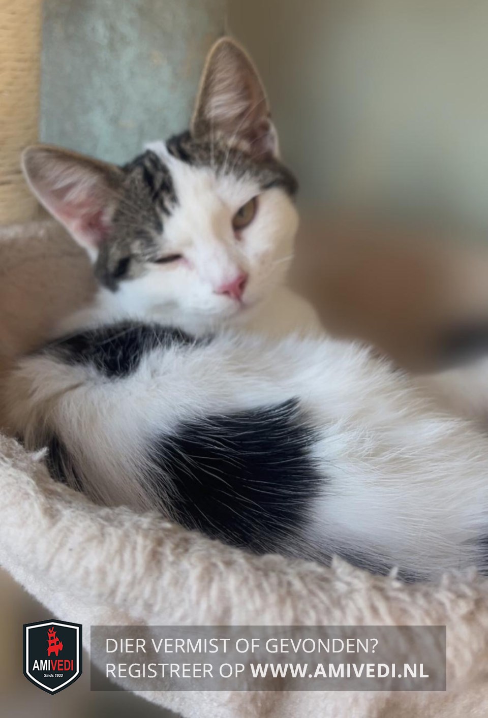 | Signalement | Witte jonge poes met zwart/grijze cyperse vlekken. Wit kopje met grijs/zwarte cyperse vlekken rondom de oren. Wit lijfje. Zwarte vlekken op de rug en op de achterpoten. Zwarte staart met enkele grijze ringen. |