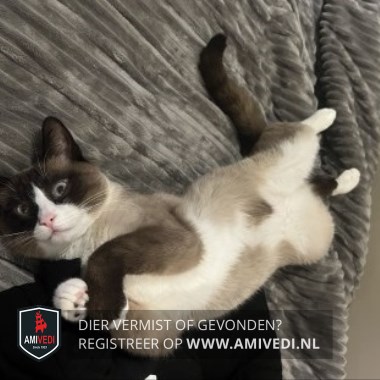 | Signalement | Siamees/ragdoll, beige met zwarte accenten gezicht, poten en staart, donkeren accenten lijf, blauwe ogen, lijkt een beetje op “Zorro”. |
