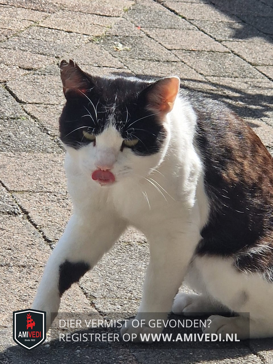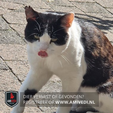 | Signalement | Zwart met witte kat. Boerderijkat dus groot van postuur. Bovenkant kopje is zwart, boven het neusje wordt het wit, waarna het onder de ogen over de gehele lengte wit wordt. Vooraanzicht; linkeroortje lijk net alsof er 'sneejtes' inzitten, alsof er in geknipt is. Pootjes zijn wit |