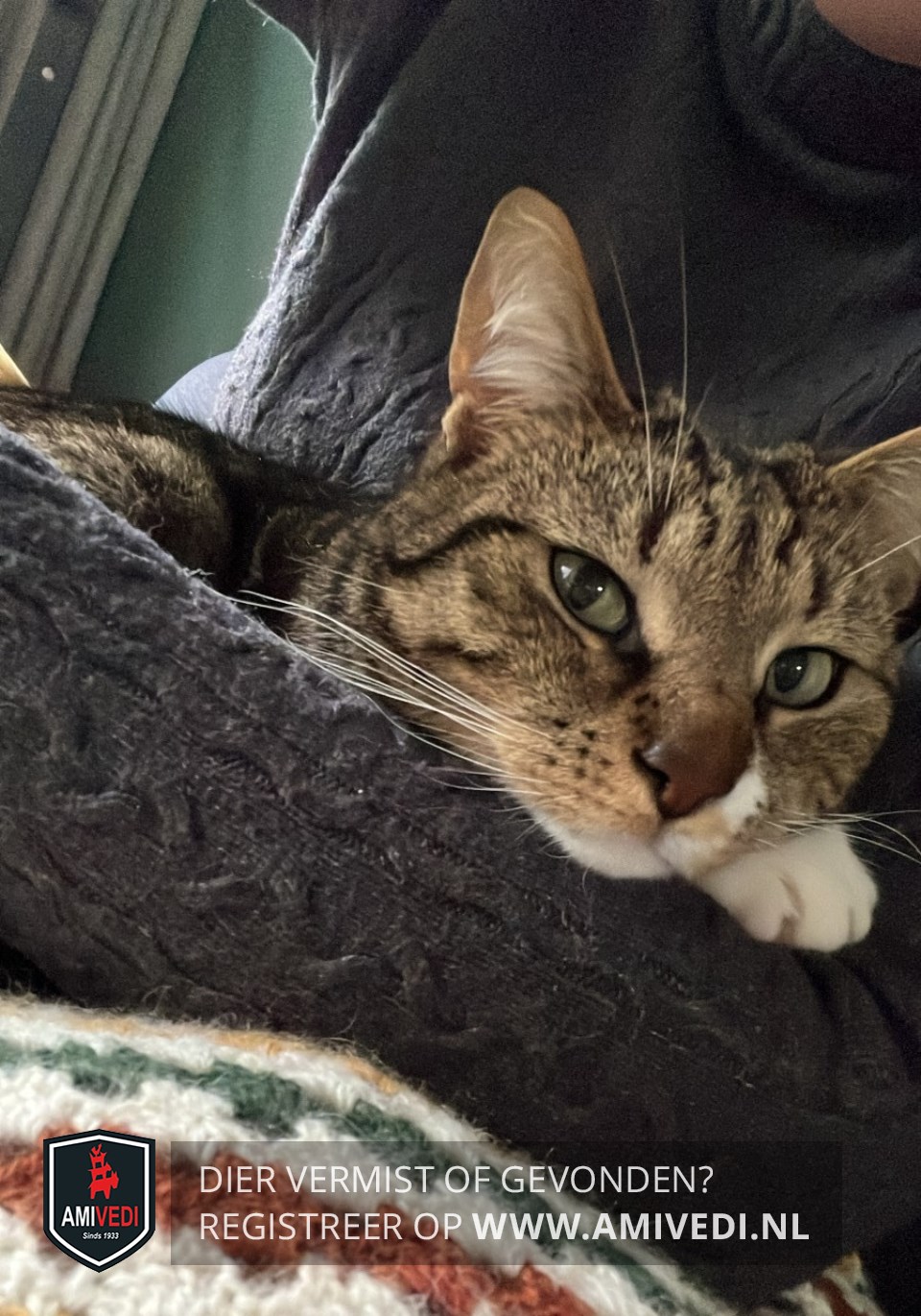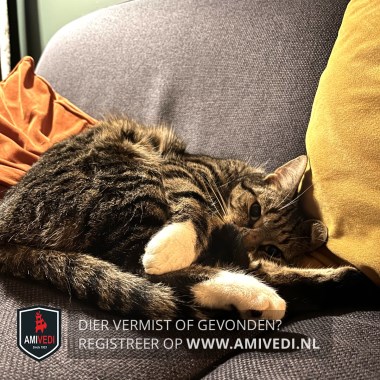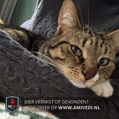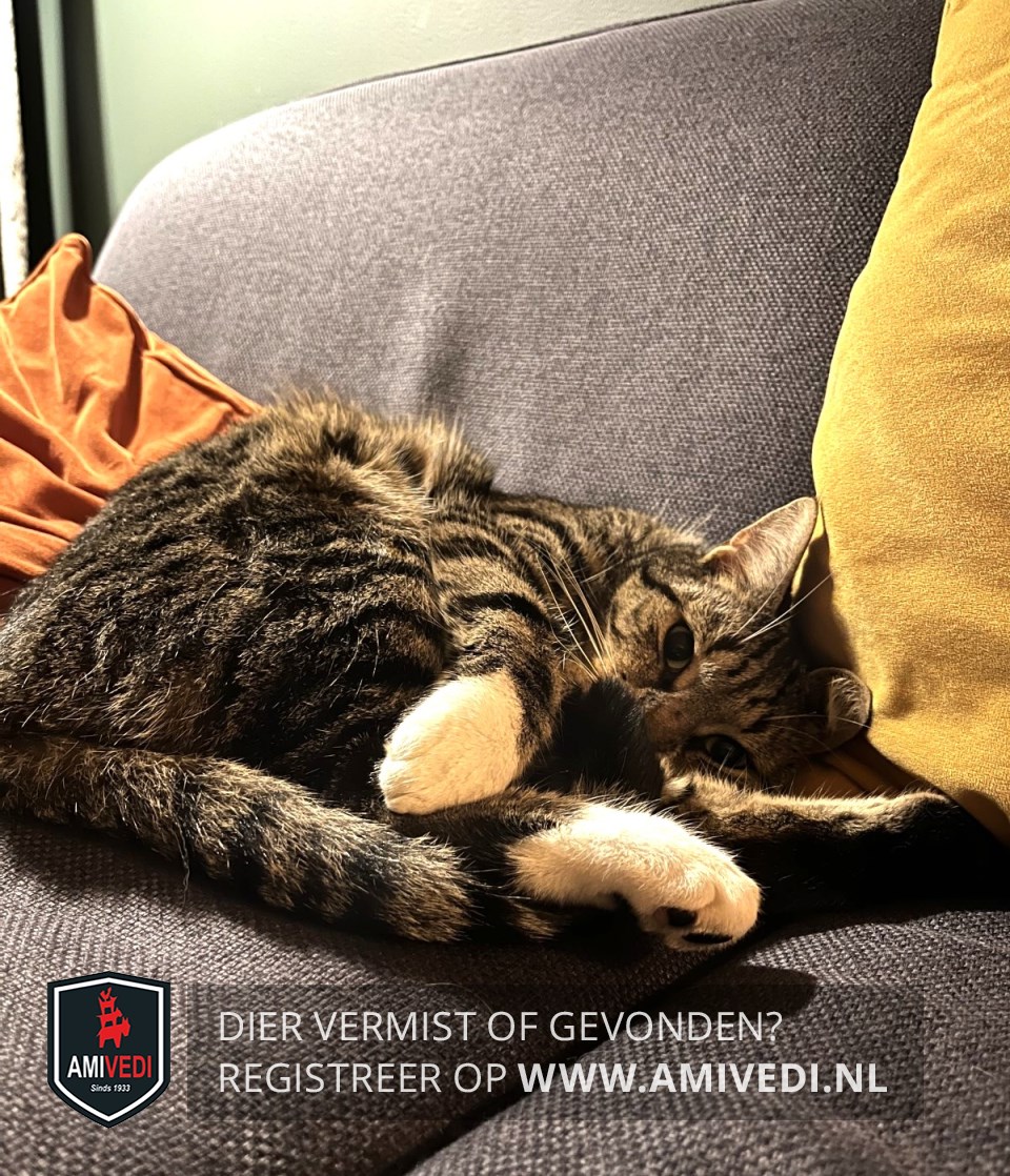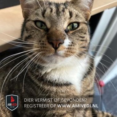 | Signalement | Cypers bruingrijs gestreept met een witte kin, witte vlek naast zijn neus, witte bef en witte sokjes. |