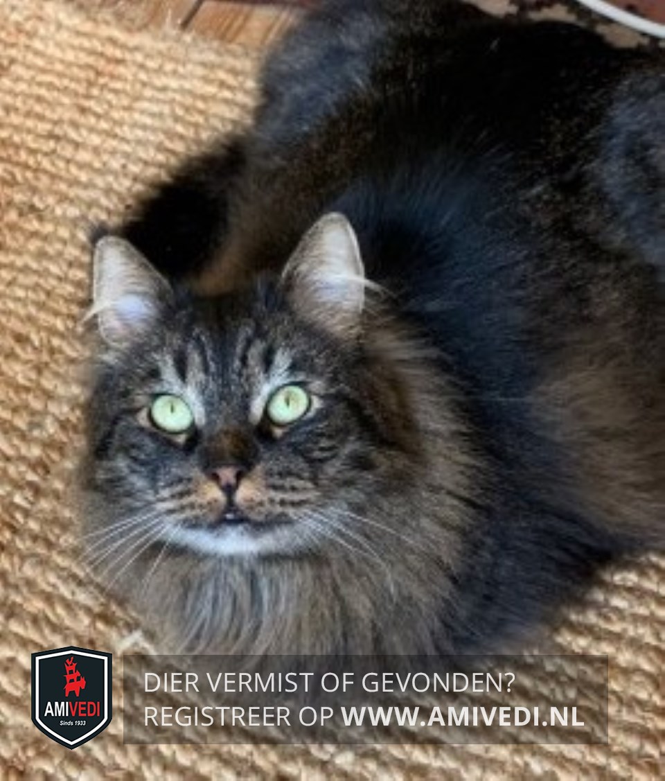 | Signalement | Langharige kleine kater. Staat laag op zijn pootjes. Witte haartjes in de oortjes. Wit boven de oogjes en witte kin. Bruin onder de neus. Verder bruin-zwart gemêleerde lange vacht. |
