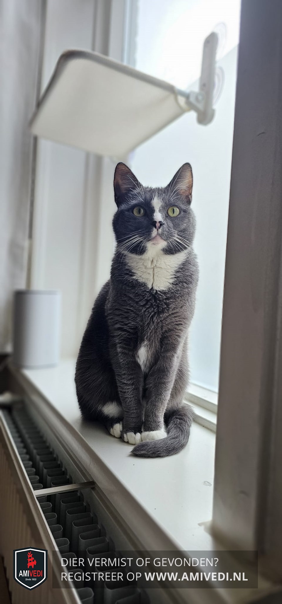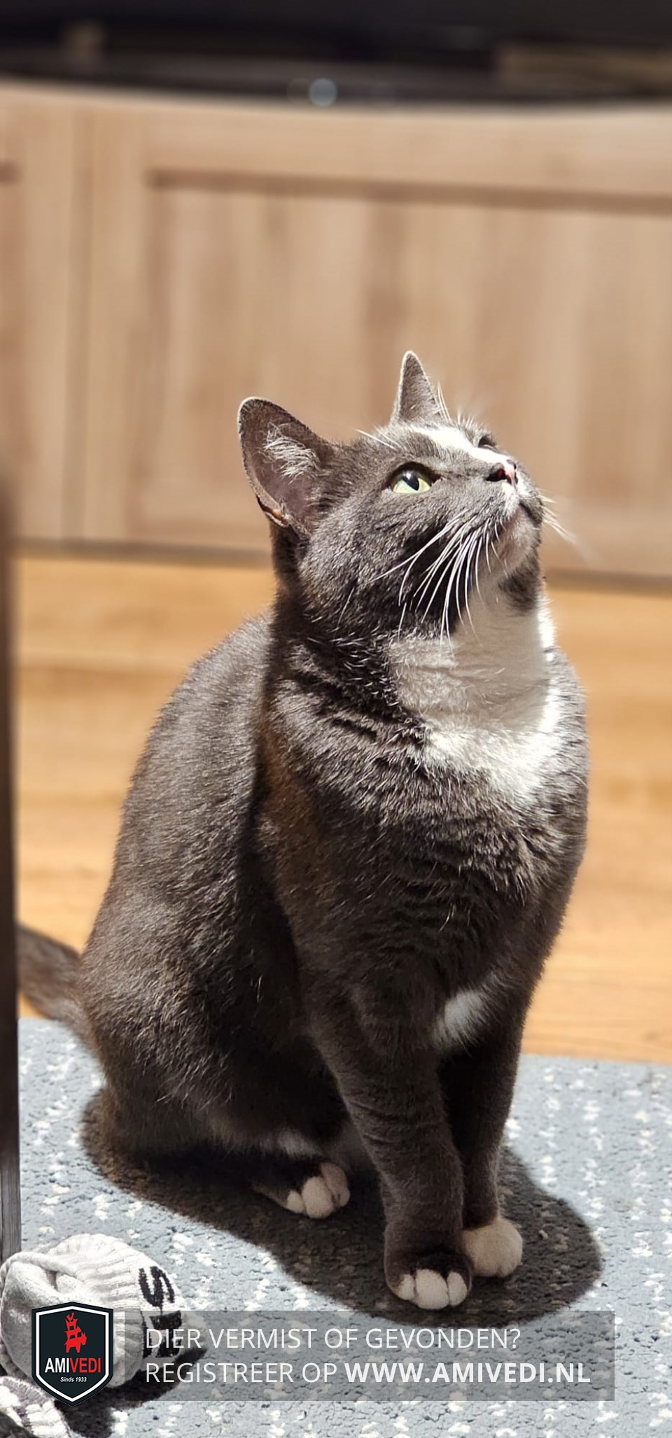 | Signalement | Egaal grijze kater met een witte streep over de bles, witte neusgaatjes en een witte kin. Brede witte bef en wat wit onder de buik. Aan de voorpootjes witte teentjes en aan de achterpootjes witte sokjes met een egaal grijs lijf. |