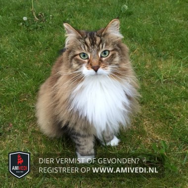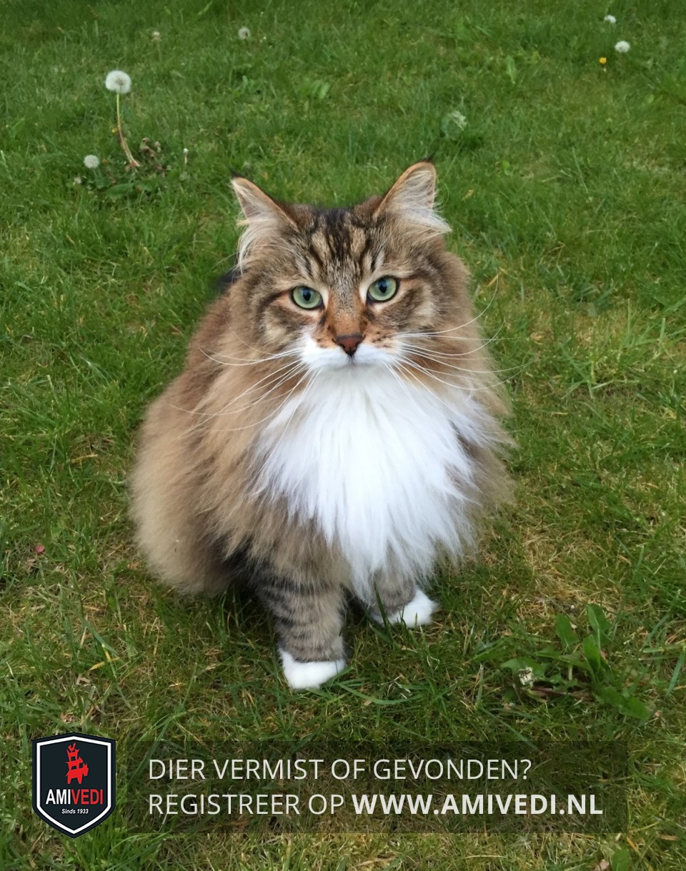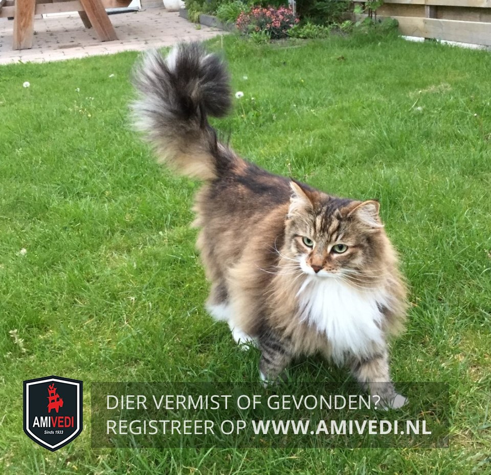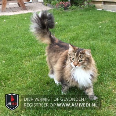 | Signalement | Cypers roodbruin/grijs/zwarte langharige poes. Roodbruin neusje. Wit snorretje, langharige witte borst en witte teentjes. Haar staart is bij de staart wortel vrij dun behaard. |