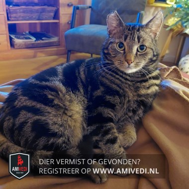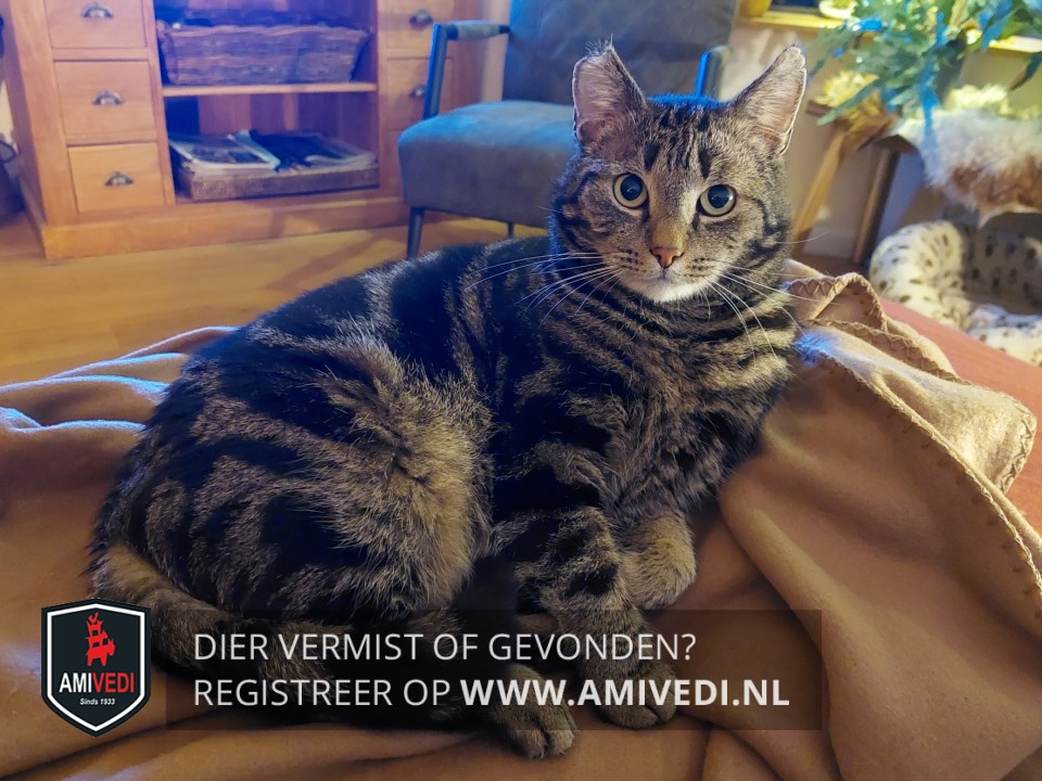 | Signalement | Vrijwel geheel cypers gestreept en gemarmerd in zwart en bruin. Witte/wittige vacht onder de neus en bij de kin. Grovere marmertekening op het lijf, grotendeels donker. Heeft een duidelijke knip / mist het puntje van het rechteroor |