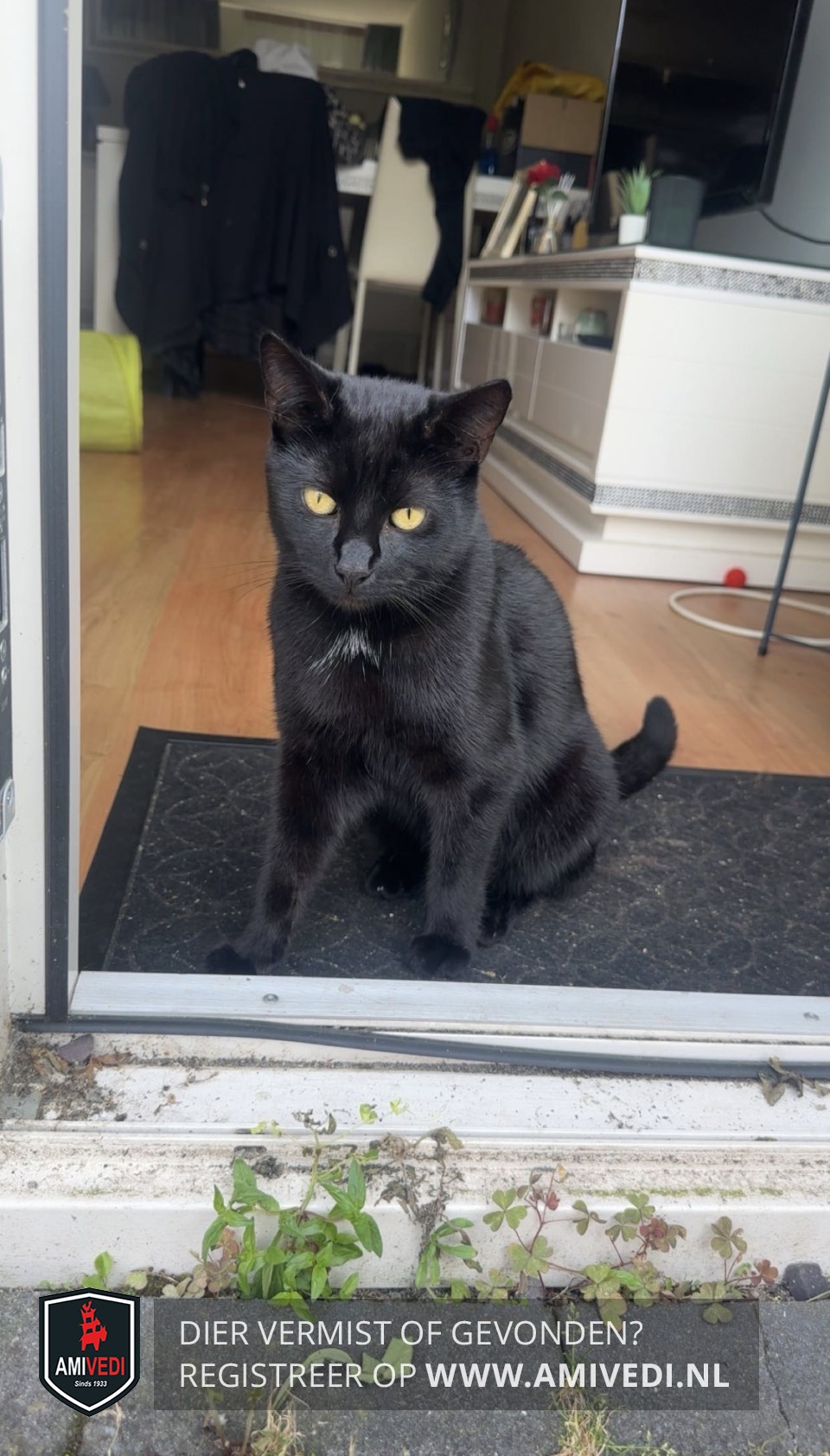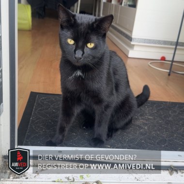 | Signalement | Zwart met een klein wit vlekje op de borst en goud/gele ogen |