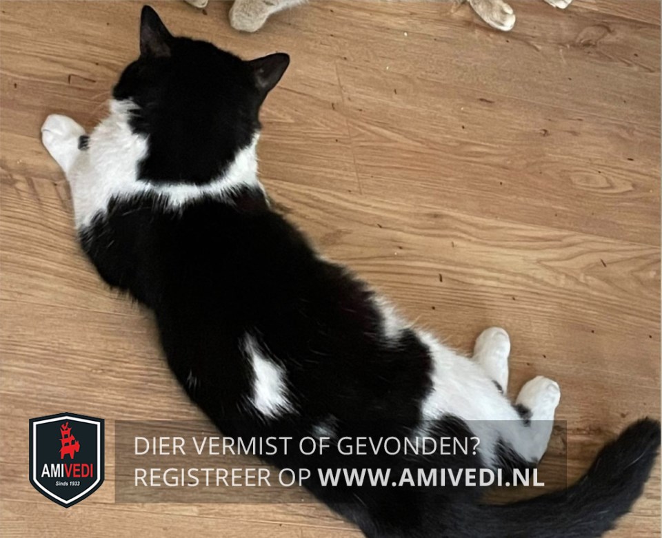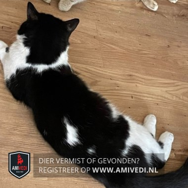 | Signalement | Batman-achtig masker op zijn kop. Gele ogen, roze neus. Wit tussen de ogen, rondom de neus en mond, kin, bef, borst en buik. Wit loopt dun door rondom de nek. Heeft twee zwarte vlekken op zijn voorpootjes. Rug zwart, halverwege bovenop de rug 2 vlekjes. Zwarte staart. |
