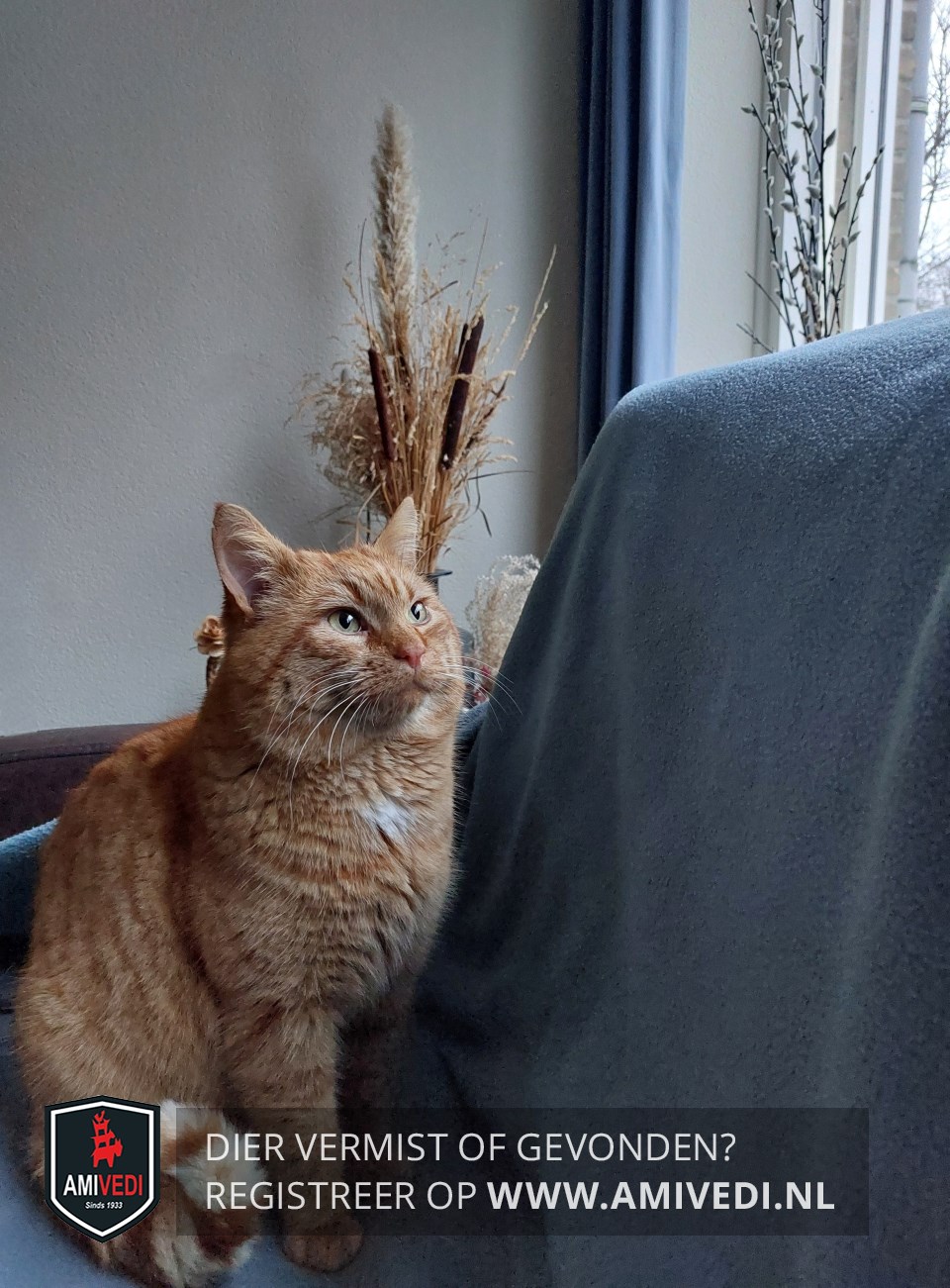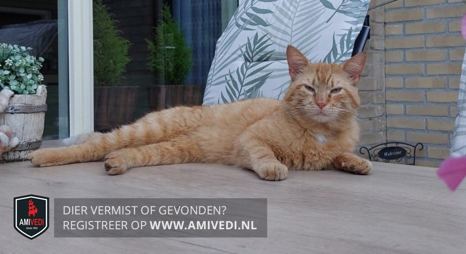 | Signalement | Cypers rood met wit, rechts een klein hapje uit het oor, klein wit vlekje op de bef, staartpunt is lichtrood. |