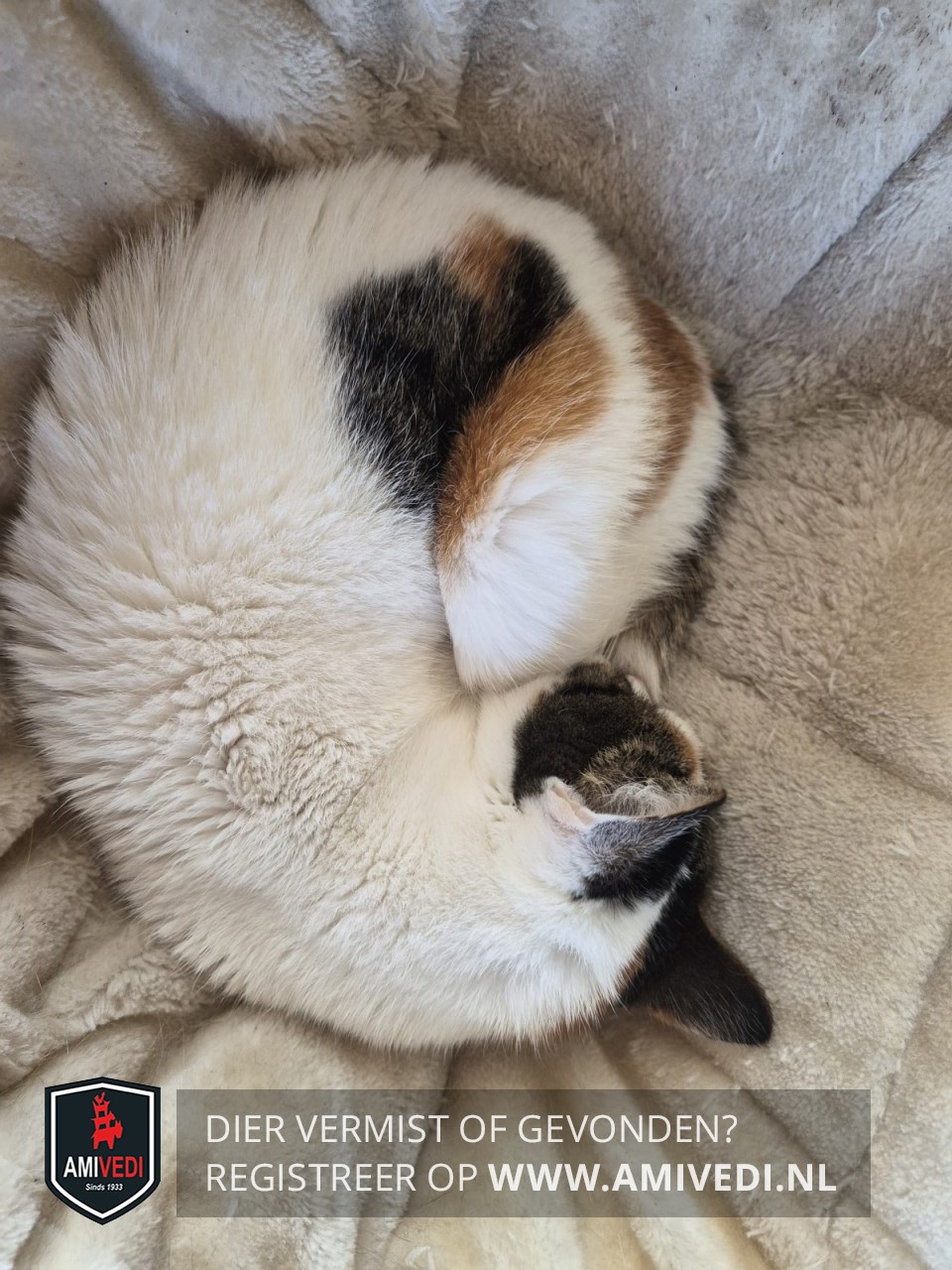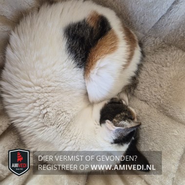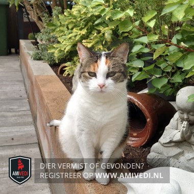 | Signalement | Lapjes poes met veel wit, cypers getekend op de bovenkant van het hoofdje, cypers rood aan beide kanten van de bles, de bles loopt door over het hoofd, aan weerszijde van de neus zit een rood stipje, op het lichaam zitten rode en zwarte-grijze vlekken, cyperse grijs-zwarte vlek op de achterkant van de linker voorpoot, grijs-zwart-witte staart. Heeft schildklier probleem en medicijnen hier voor nodig. |