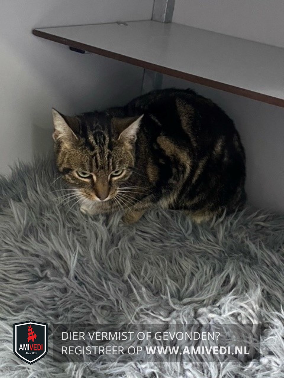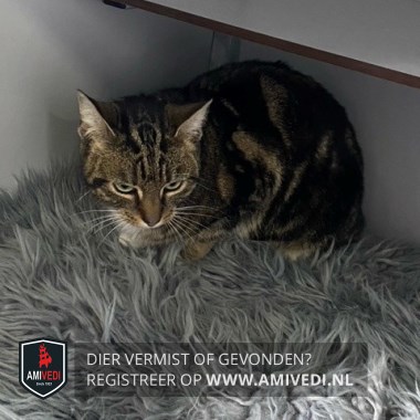 | Signalement | Cypers bruin/zwart gestreept. kin wit. |
