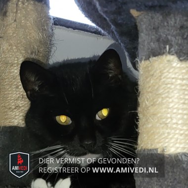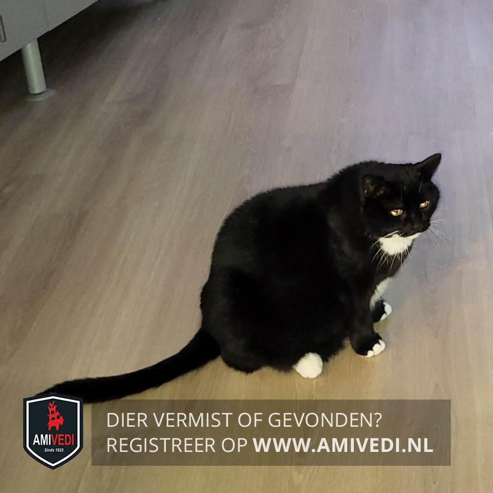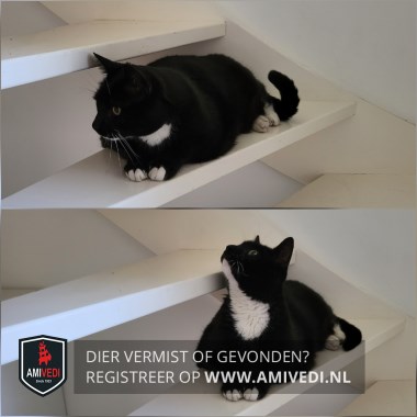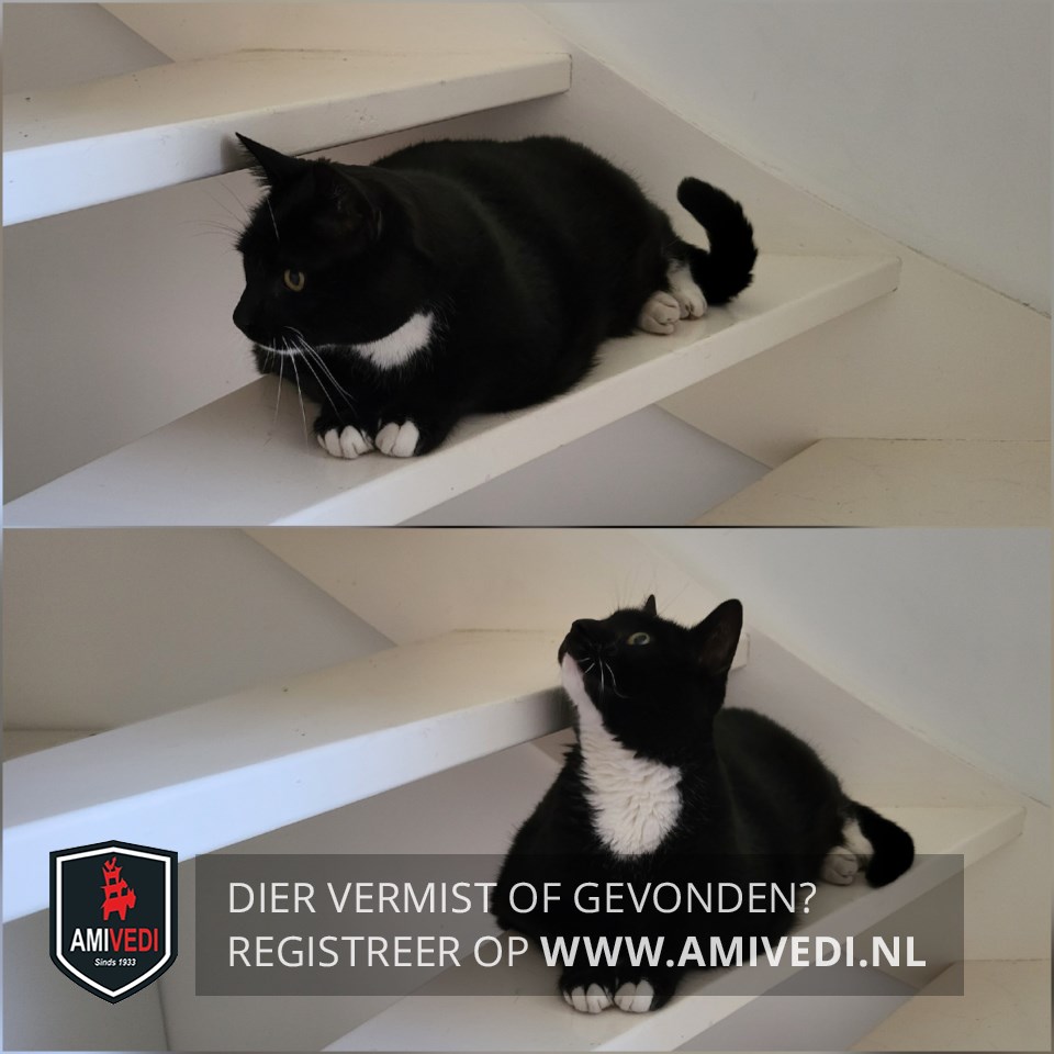 | Signalement | Zwart met witte snorharen, witte kin loopt door over de bef, witte tenen voorpoten, witte borst, witte voetjes achterpoten, grote kat. |