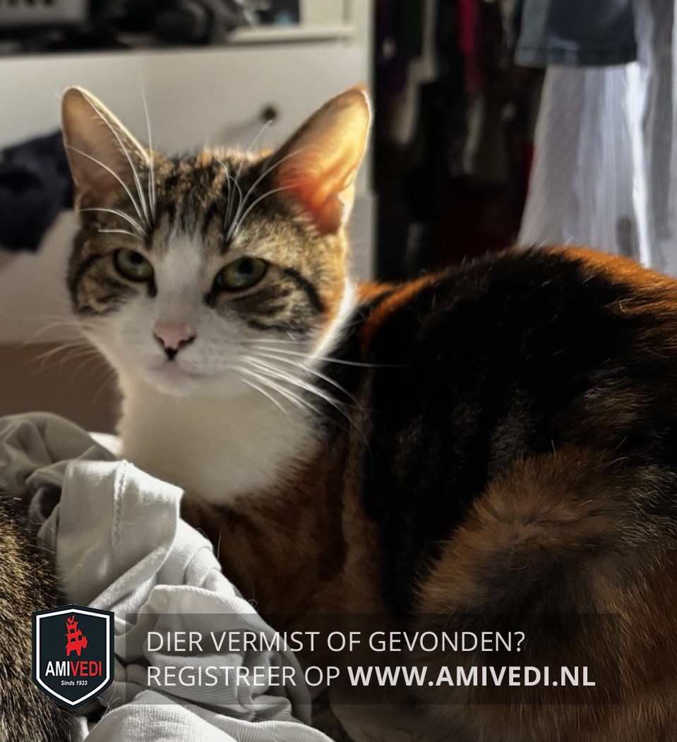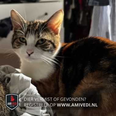| Signalement | Schildpad poes, bruin, zwart, rood/oranje en wit. Kopje bruin met zwart gestreept en witte bles, wit snuitje en witte kraag en bef. Rug en flanken zwart met rood/oranje gemêleerd. |