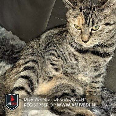 | Signalement | Grijze cyperse poes, met lichtelijk wat rood in haar vacht. Cypers kopje met boven het rechteroog een rood/oranje vlek. Lichter rondom het bekje en op de buik. Geringde staart met een lichtoranje uiteinde. |