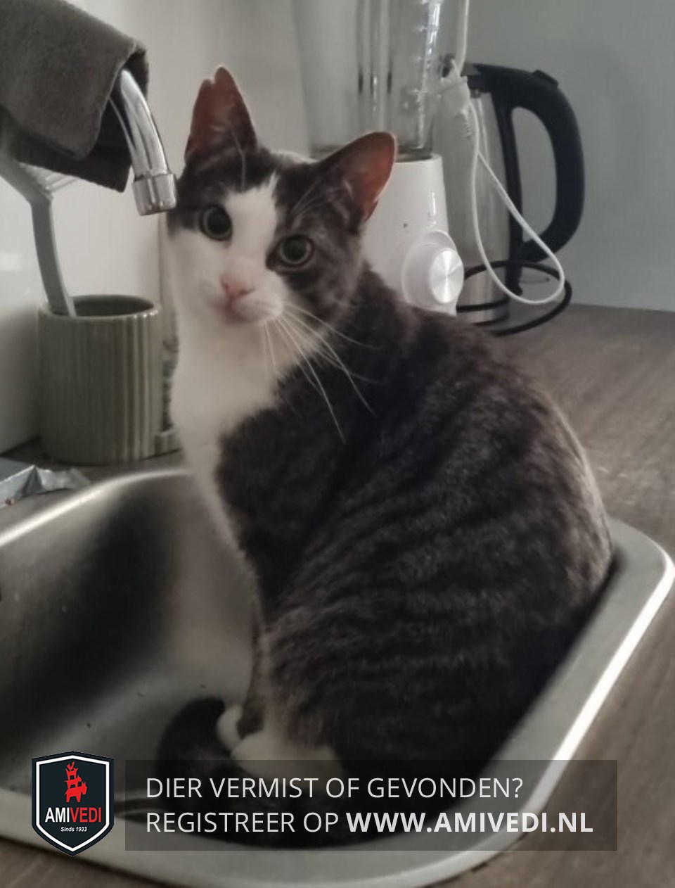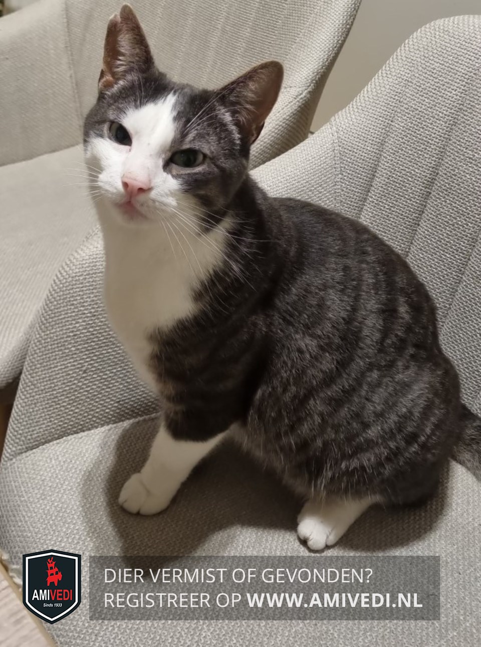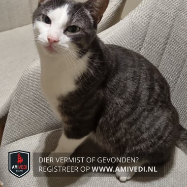 | Signalement | Cypers grijs/zwart gestreept met wit Hij heeft een scheurtje in zijn rechter oor. Omgekeerde witte V op zijn voorhoofd. Witte wangen, witte kin, witte borst. In ieder geval aan de linkerkant witte sokken. |