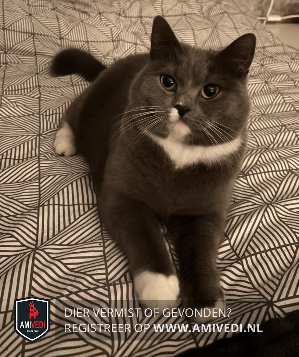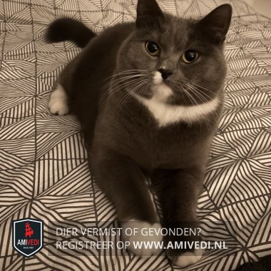 | Signalement | Grijs met witte poes. Grijs kopje met rechtsonder de neus een wit plekje. Smal wit kinnetje. Witte bef. Grijs lijf, met deels witte buik. Grijze pootjes. Rechtervoorpoot heeft een wit voetje. Linkervoorpoot heeft enkele witte teentjes. Rechterachterpoot heeft een wit sokje. Grijze staart. |