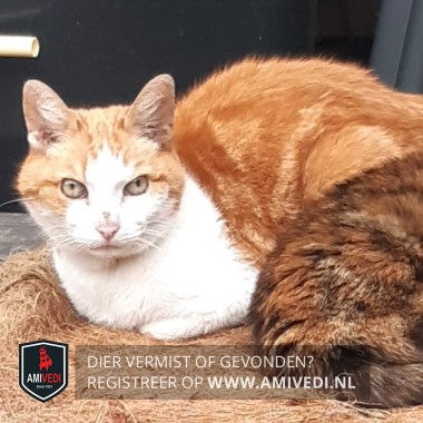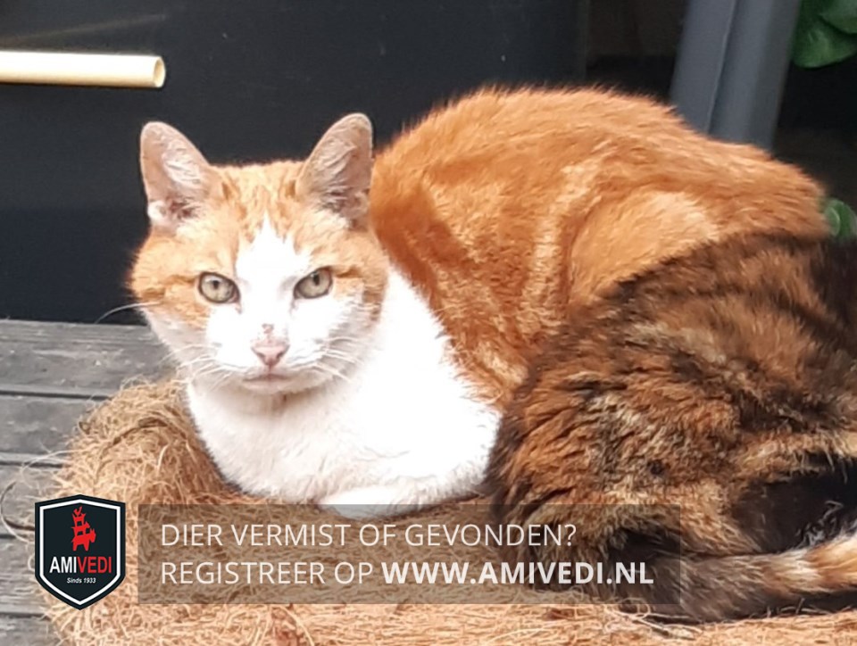 | Signalement | Cypers rood gemarmerd met een wit snoetje, witte borst, witte poten voor, Heeft geen staart meer. Reageert niet of nauwelijks op roepen. Is slechthorend. Ook kan hij wat schuw zijn. |