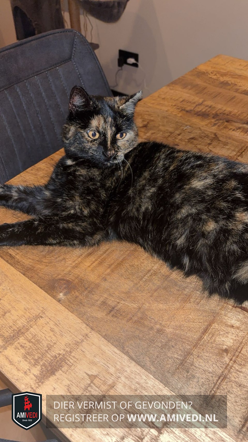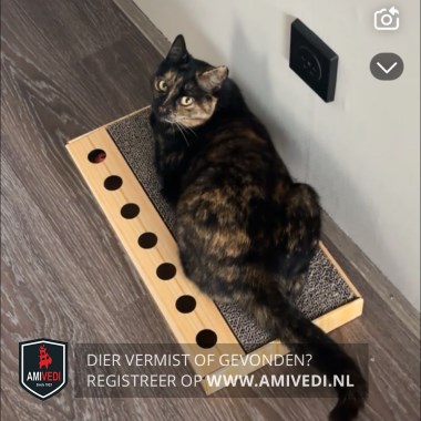 | Signalement | Kop zwart/bruin gemêleerd, bruin boven het rechter oog, linkerwang beige met wat zwart. Lijf zwart/bruin gemêleerd. Beige teentjes. |