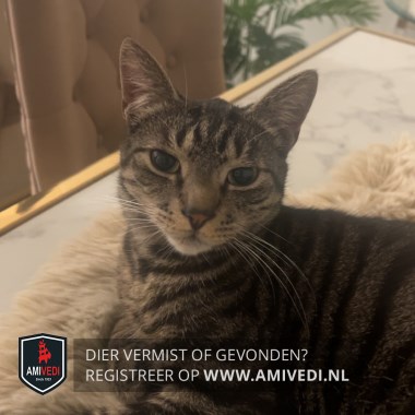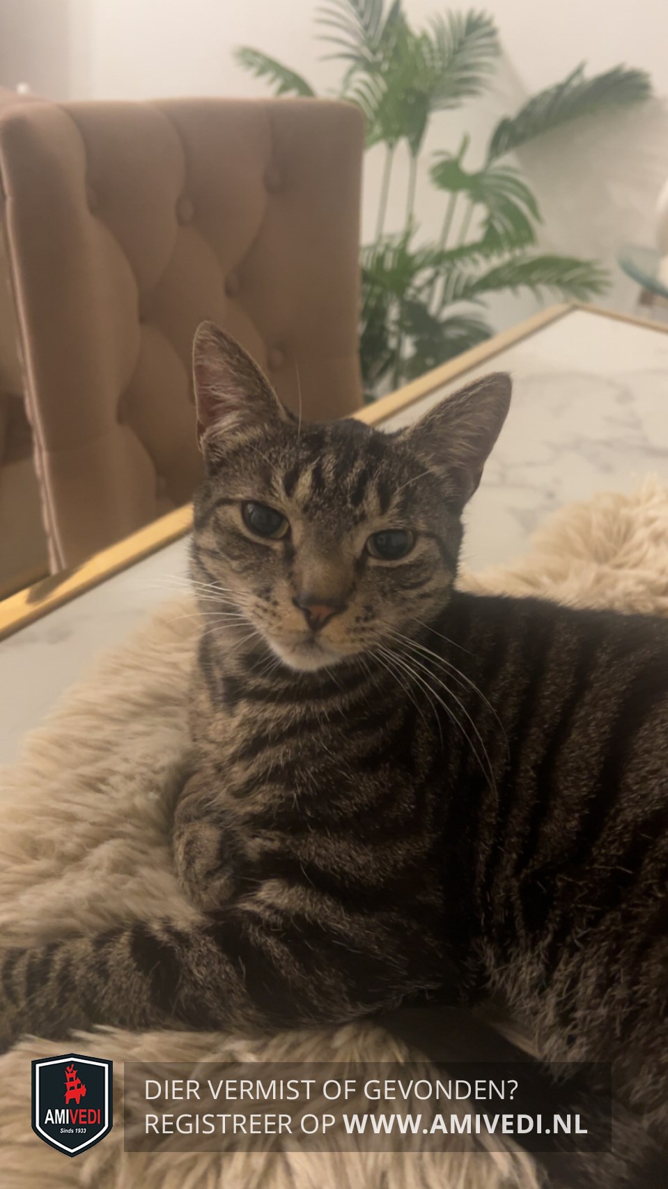| Signalement | Cyperse kat. Witte streep onder ogen. Witte kin. Hij heeft een kleine kopje op zijn lichaam. |