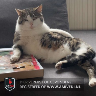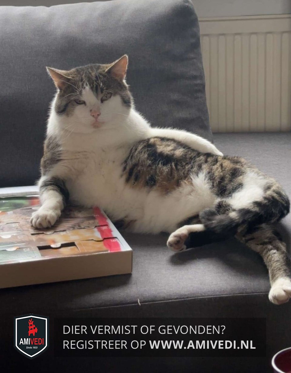 | Signalement | Europese korthaar kater, grijs/bruin met zwart gestreept en wit. Bovenkant kopje grijs/bruin gestreept, witte bles en witte snuit. Witte borst en witte buik. Rechter voorpootje wit en linker voorpootje wit met grijs/zwart gestreepte vlek. Rug grijs/bruin met zwart gestreept doorlopend over de flanken en de staart. Achterpoten met witte voetjes. |