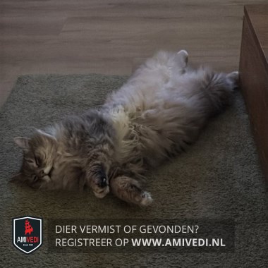 | Signalement | Bruin/grijs gemêleerd, beige rond de bek, lichte teentjes, beige buik. Heeft een klein bultje achter bij zijn heup. |