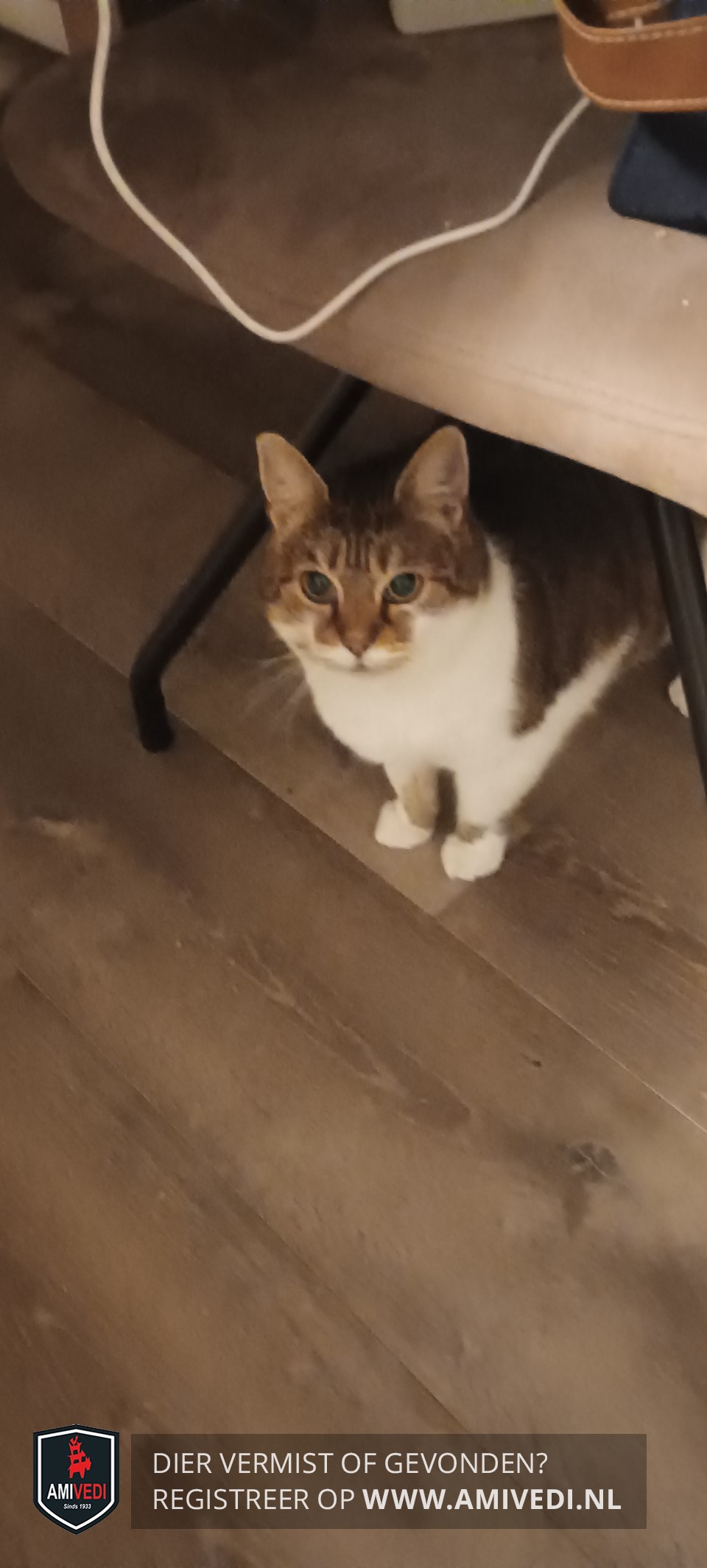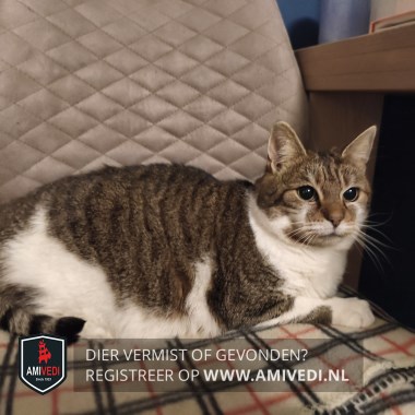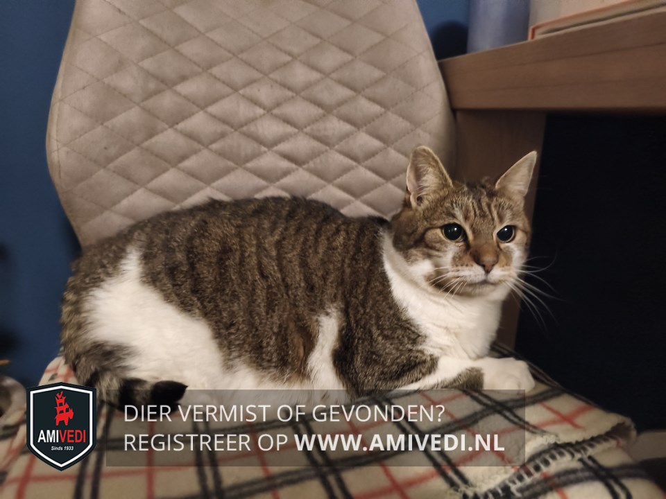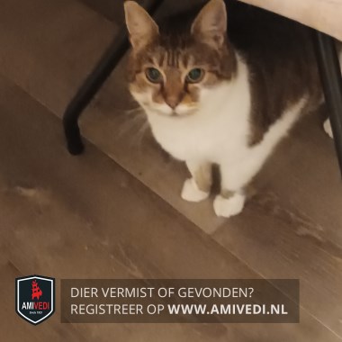 | Signalement | Cypers bruin - zwart met wit, cyperse oren en kopje met witte rand langs de bovenlip, witte kin en bef loopt door naar de borst en buik, witte voorpoten met op rechter voorpoot een vlek aan de binnenzijde, bij de linker voorpoot zit een vlek net boven het voetje, cyperse rug en flanken, cyperse staart, stevige poes, erg angstig. |