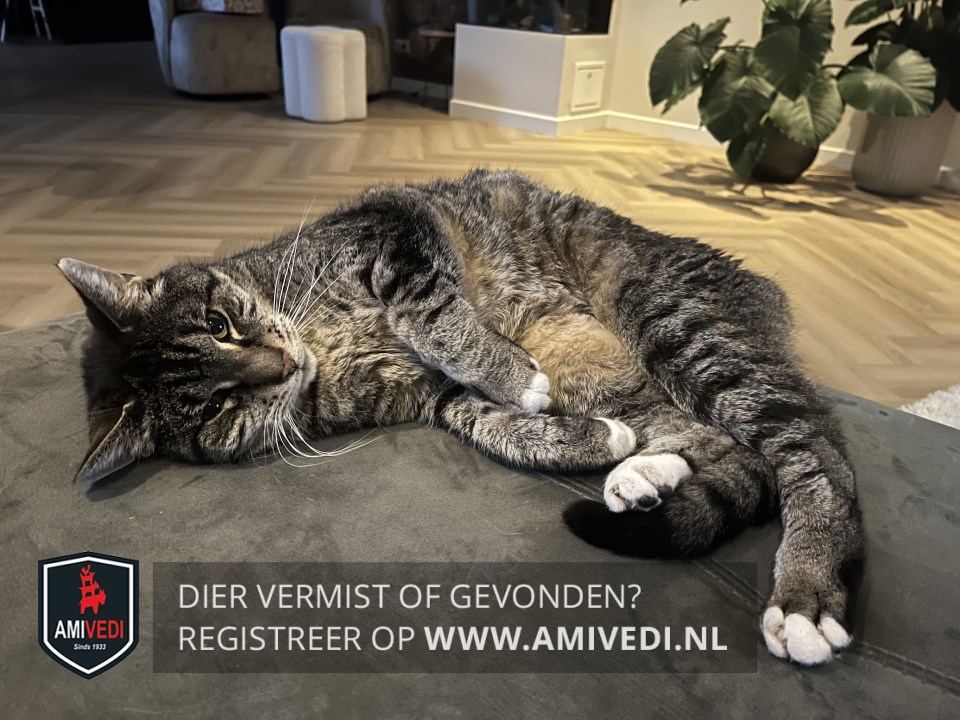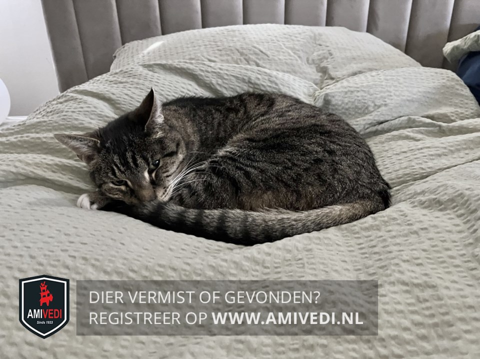 | Signalement | Cypers grijsbruin, witte kin en bef, klein vlekje onderaan de borst, witte voetjes, witte tenen linksvoor. |