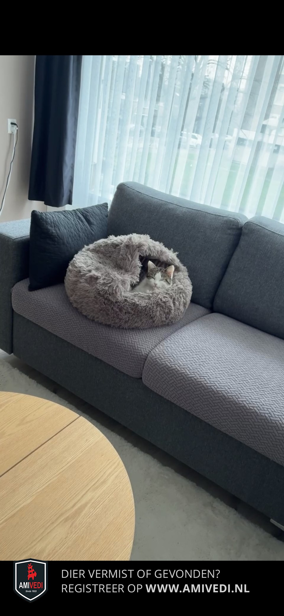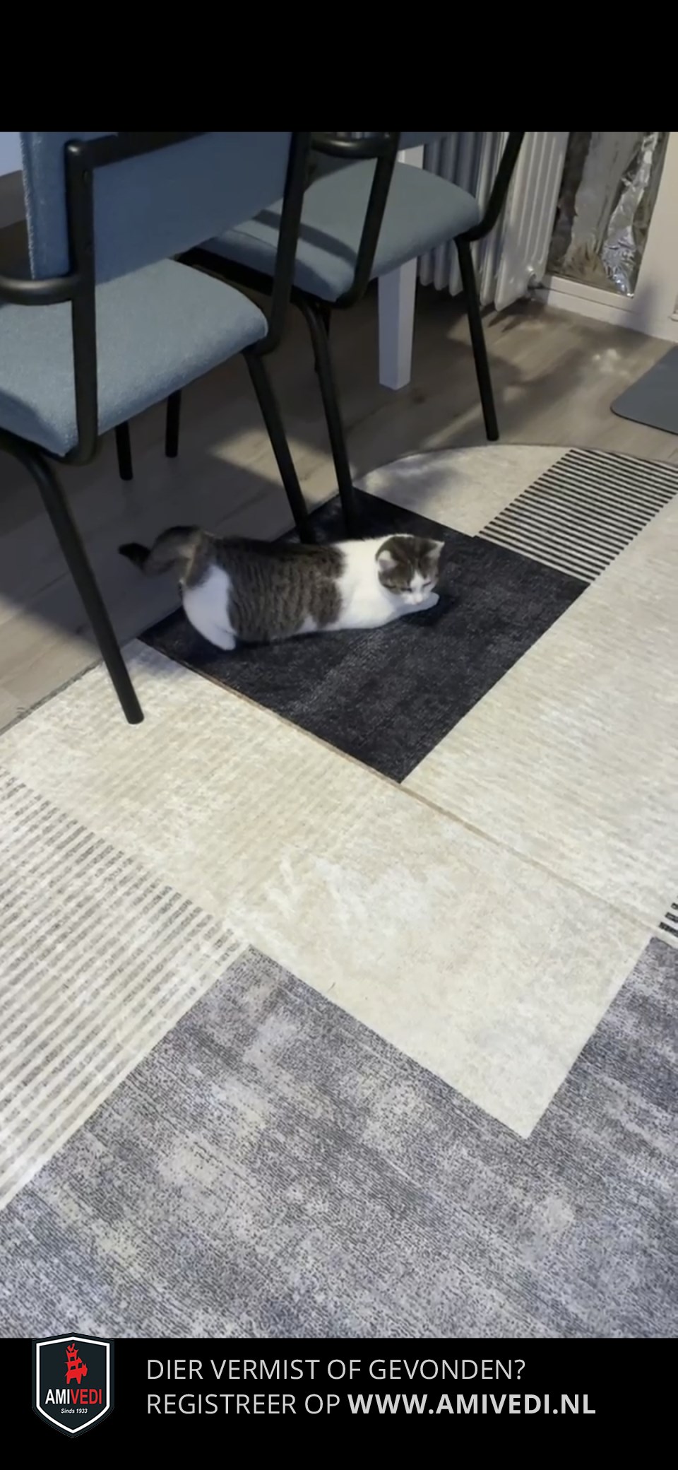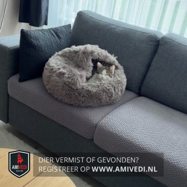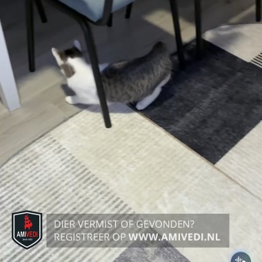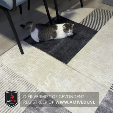 | Signalement | Witte bek en witte oortjes, grote cypersgrijze vlek op de kop en rug, witte kraag, witte buik en poten. Ze heeft een blauwe lavendel bandje om. Ze loopt aan de onderkant van haar buik met een open wond omdat ze een week geleden uit een operatie komt. |