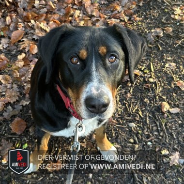 | Signalement | Bruine wenkbrauwen.Witte bek.Witte streep tussen de ogen.Witte borst,witte sokken aan de voor en achterpoten.Zwarte rug.Het is een kruising tussen de Zwitserse Sennenhond en de Appenzeller Herder. |