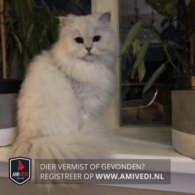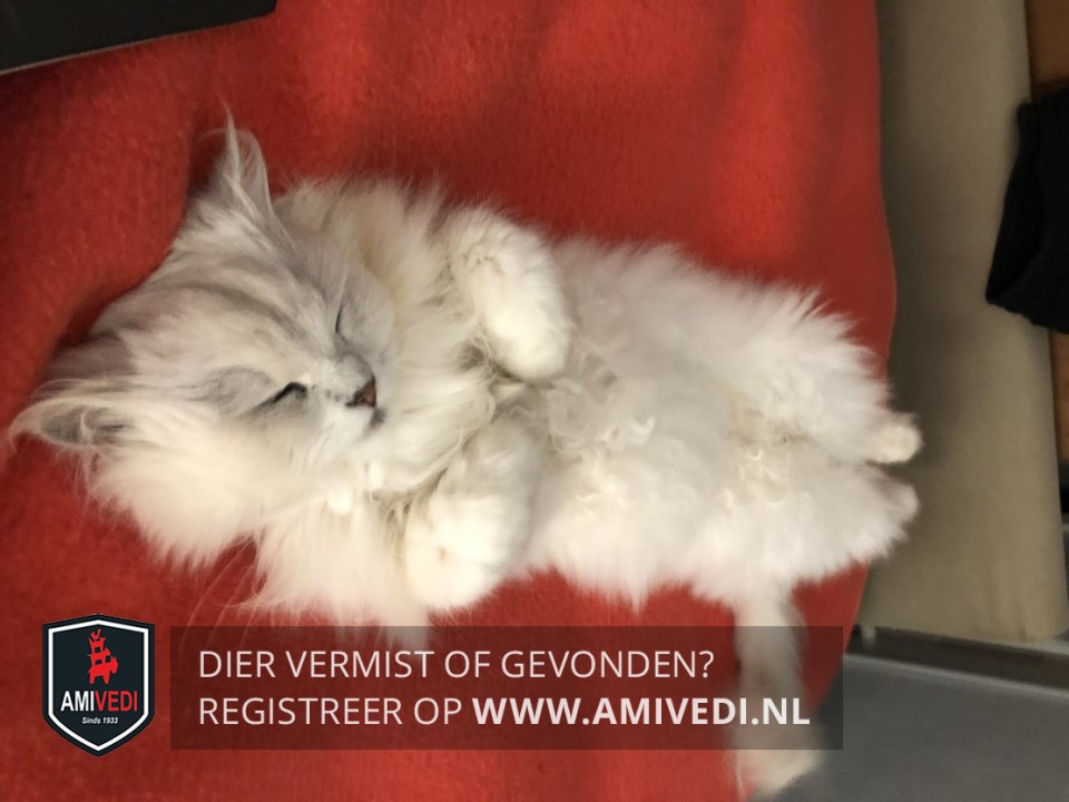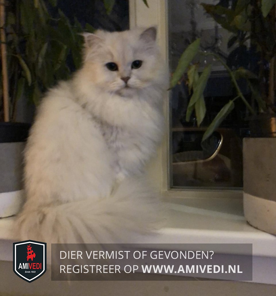 | Signalement | Wit. Geheel wit langharig. Groene ogen, zwart omrand. Steenrode neus. Kwastjes op de oren. Heel vaag iets grijzigs op de rug. |